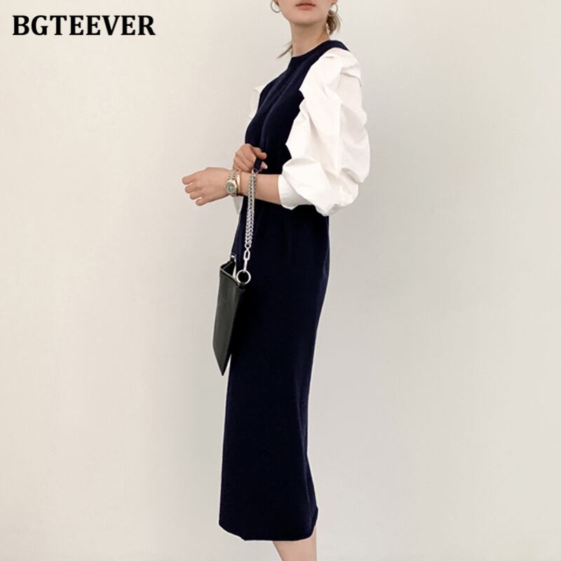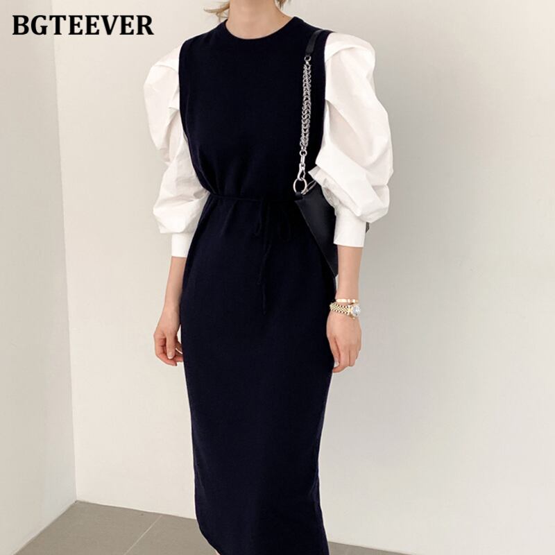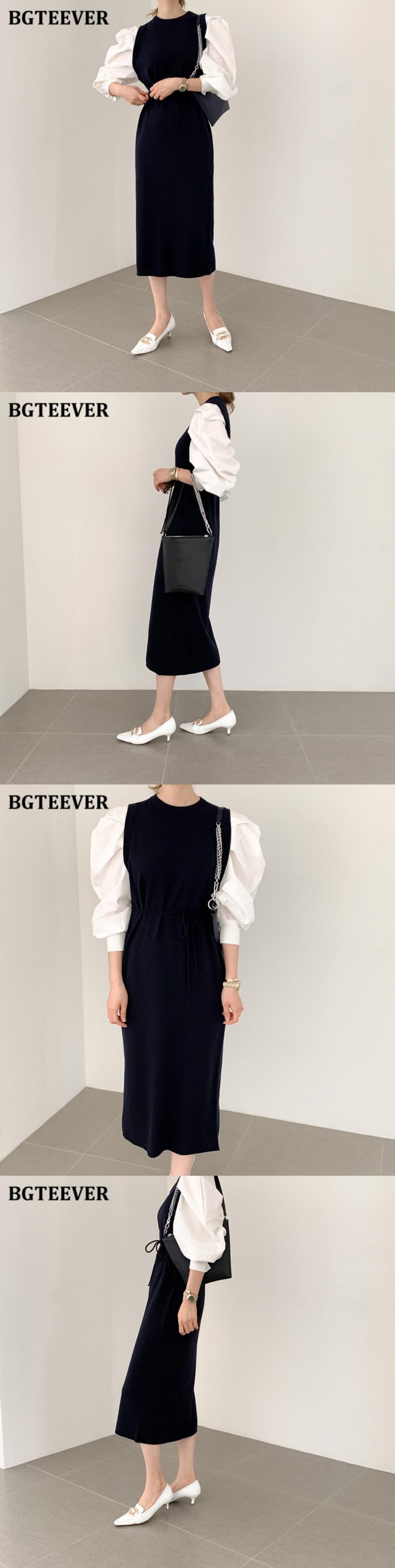 【新作】【送料無料】 BGTEEVERヴィンテージパフスリーブパッチワークレディースニットミディドレスOネックスリムウエストレースアップセータードレスVestidos ビンテージ 12b117812175700