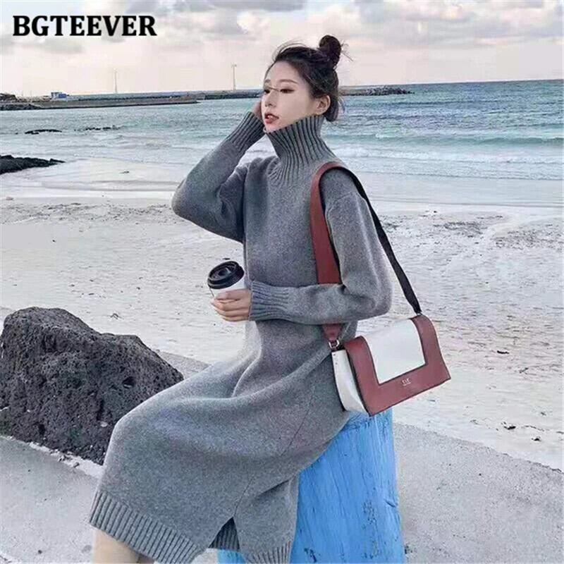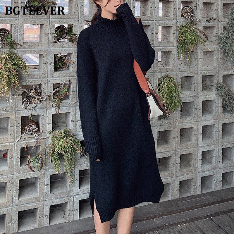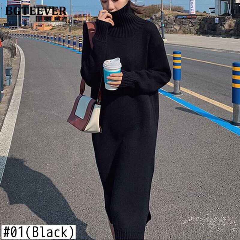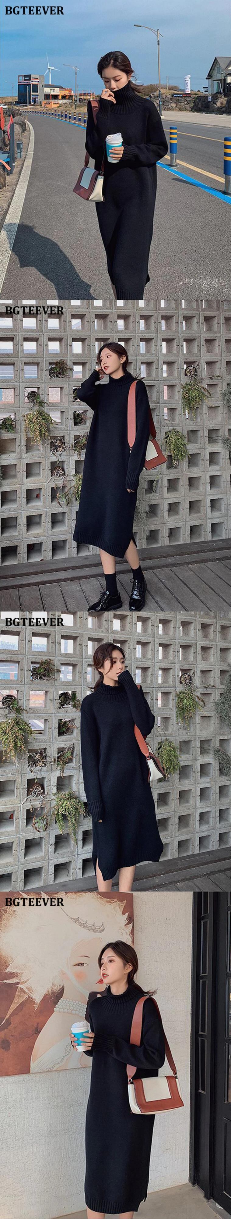 【新作】【送料無料】 秋冬厚手のルーズセーターミッドカーフドレスタートルネックサイドスプリット女性暖かいニットVestidos オータム 秋物 ウィンター 冬物 12b127009348915