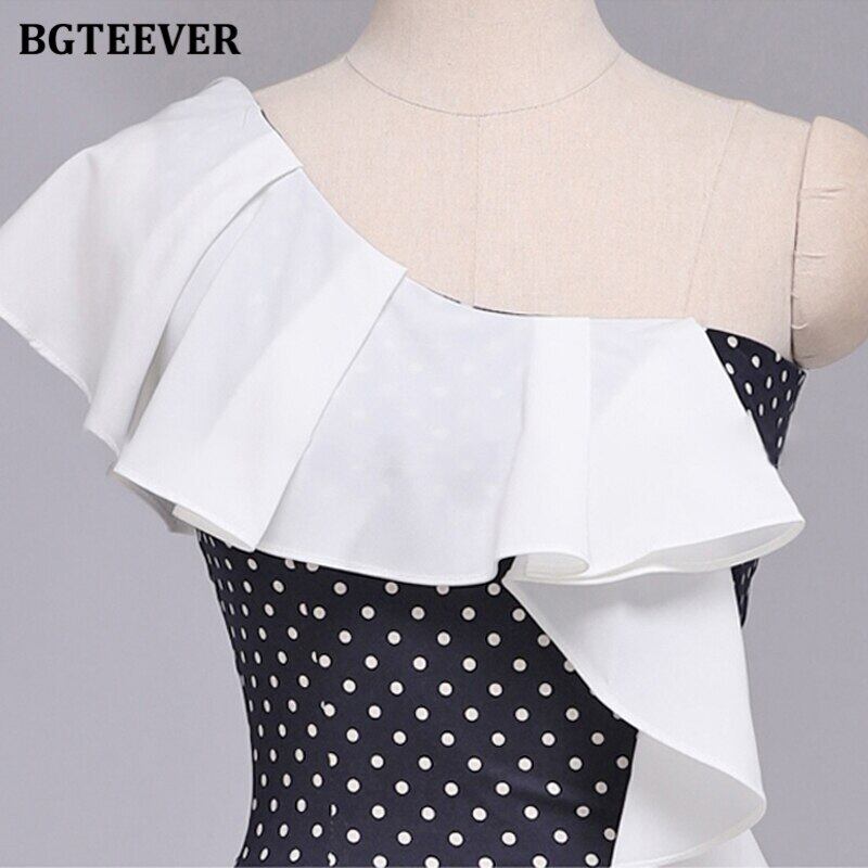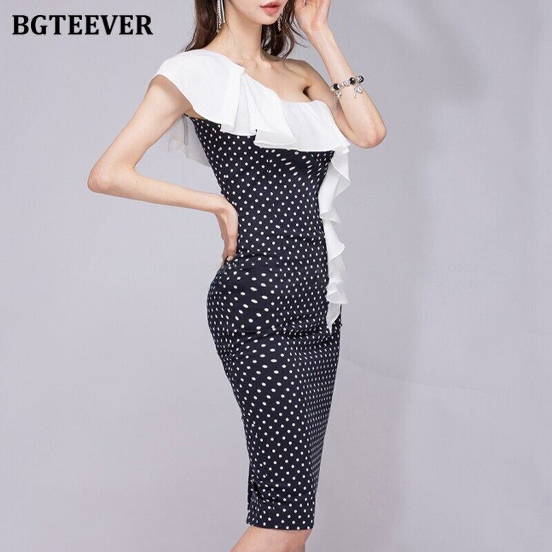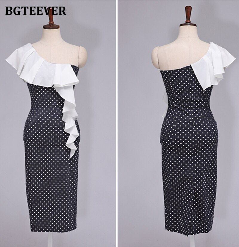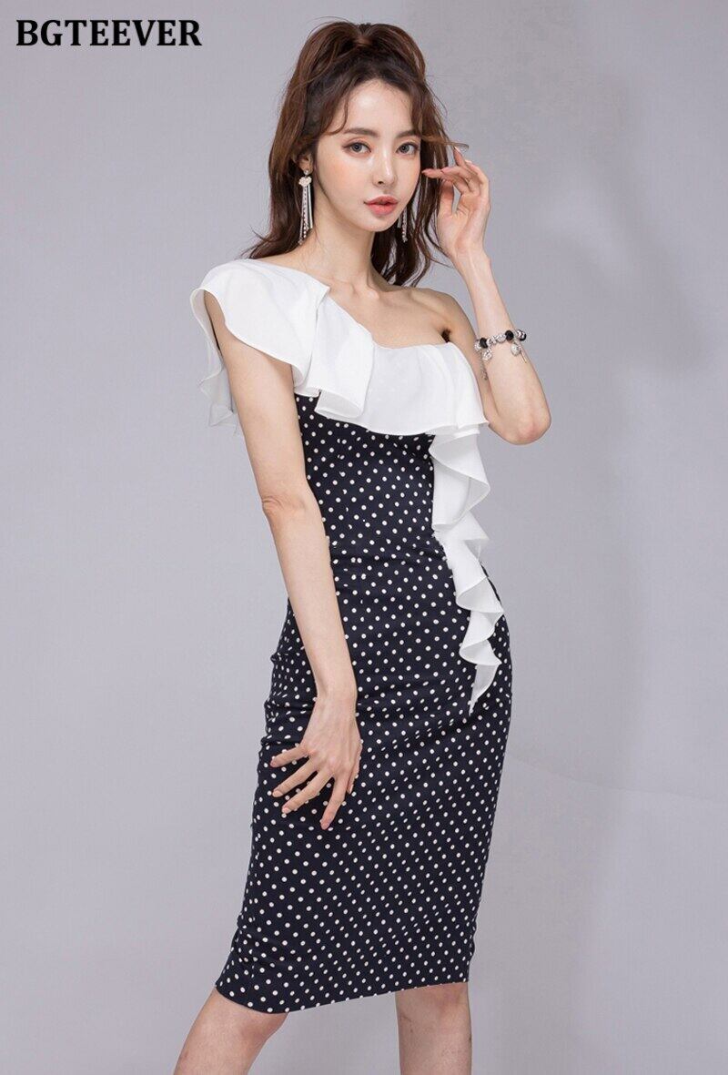 【新作】【送料無料】 BGTEEVERレディワンショルダーフリルスキニードレスポルカドットスプリットボディコンパーティードレスサマーペンシルベスティドス2020 ラッフル 夏物 12b197033697686