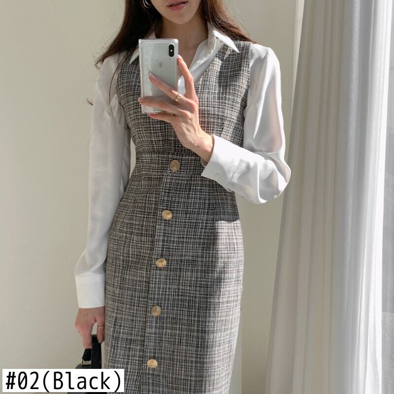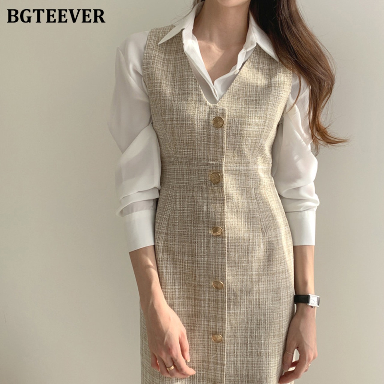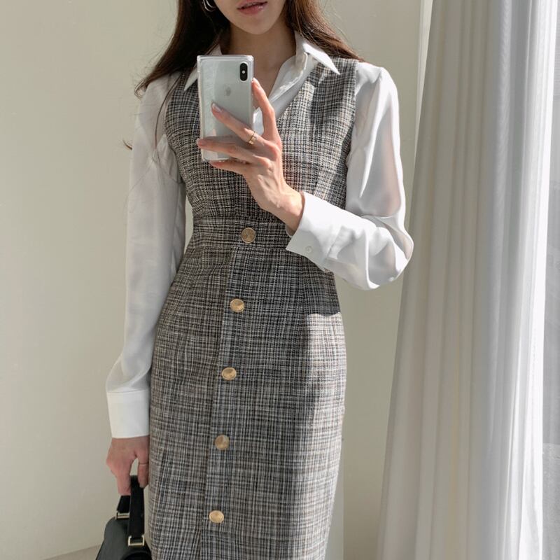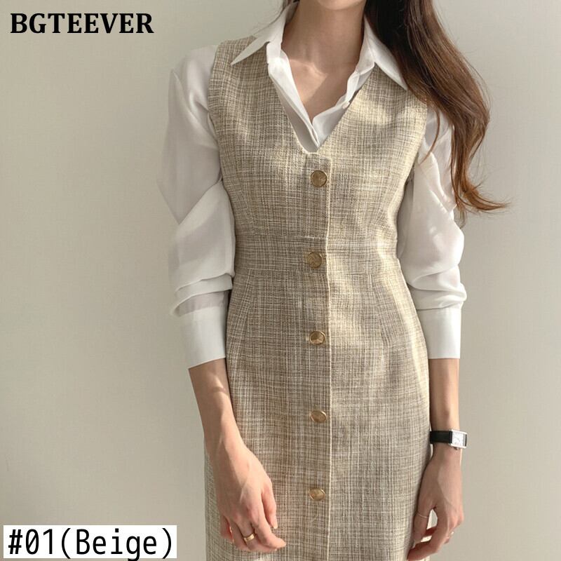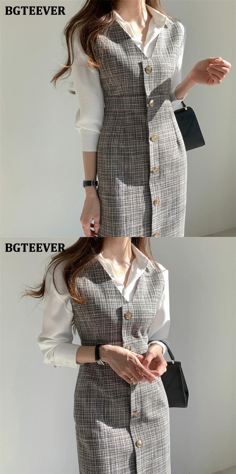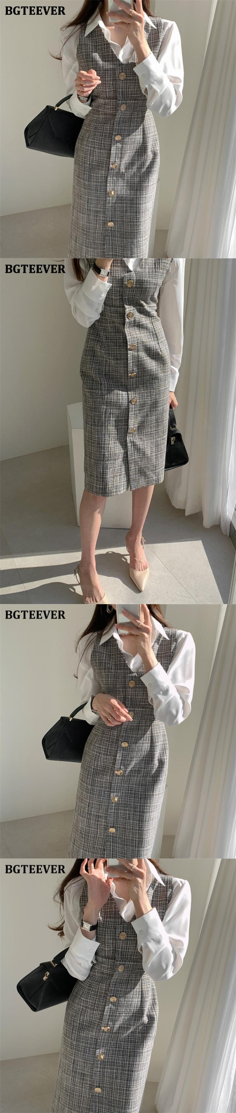 【新作】【送料無料】 BGTEEVER秋のツーピースレディースセット長袖ホワイトシャツブラウス&Vネックシングルブレストノースリーブチェック柄ミディドレス ロング オータム 秋物 12b183719307774