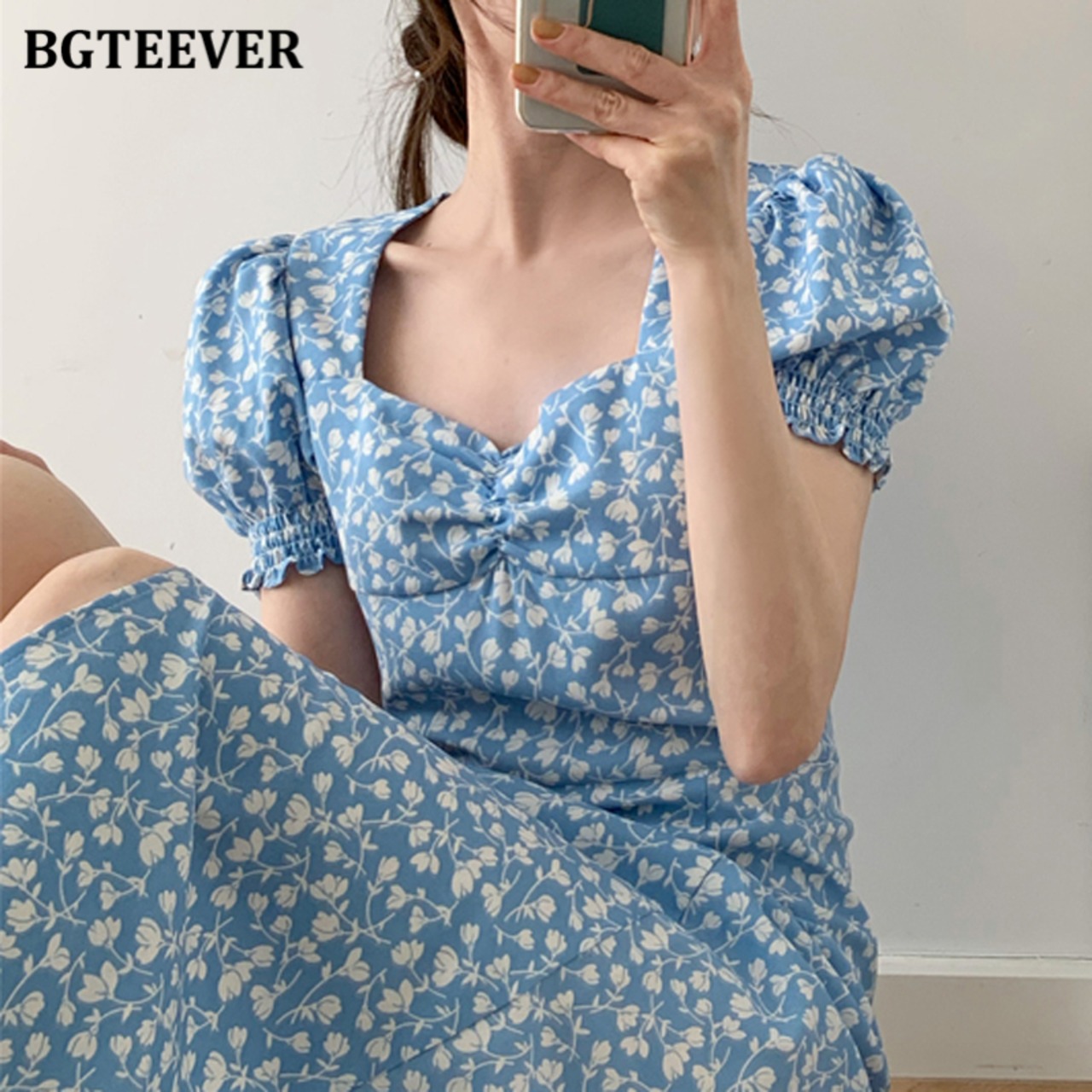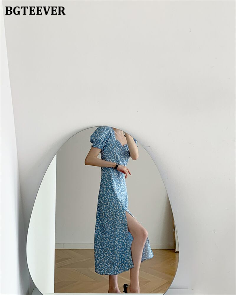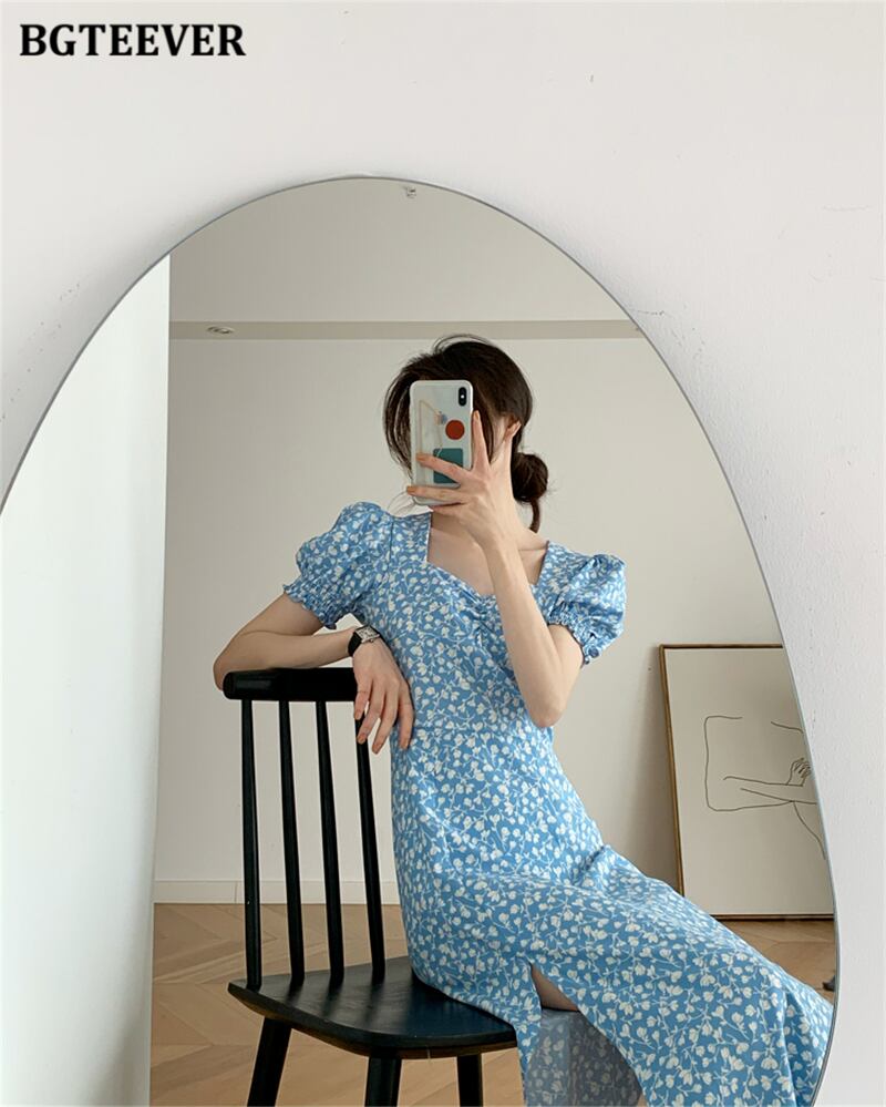【新作】【送料無料】 BGTEEVERヴィンテージフローラルレディースドレススクエアカラーパフスリーブスプリットプリントドレス2020サマースリムウエストAラインVestidos 夏物 花柄 スクウェア ビンテージ 12b129034034952