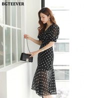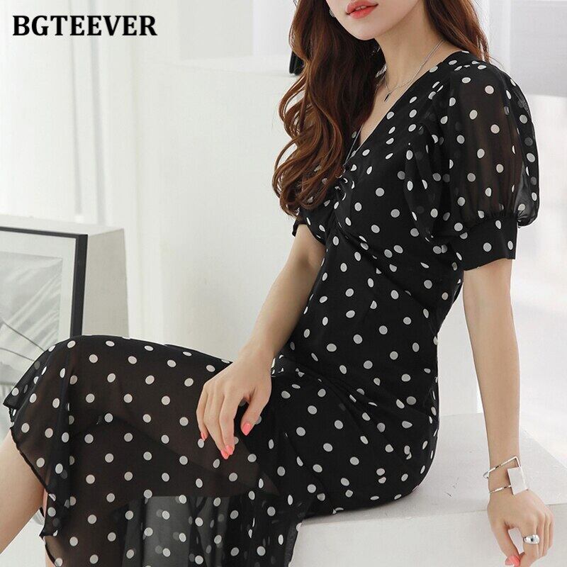 【新作】【送料無料】 BGTEEVERサマーポルカドットレディースミドル丈ドレスVネック半袖ワンピース2020スリムウエストVestidosfemme ショート ハーフスリーブ 夏物 フェミニン 12b140041431682