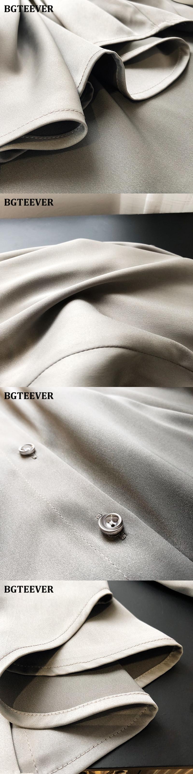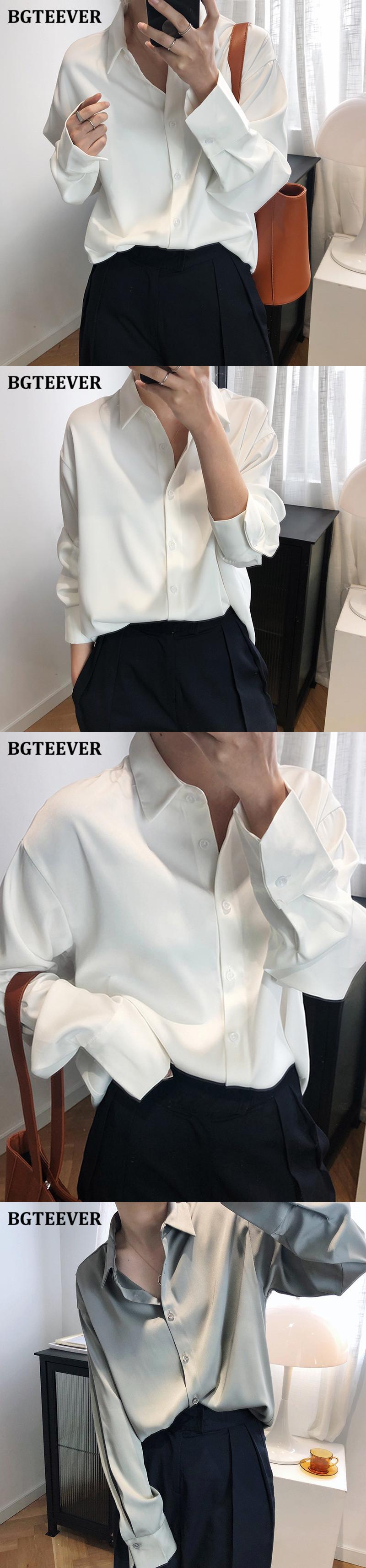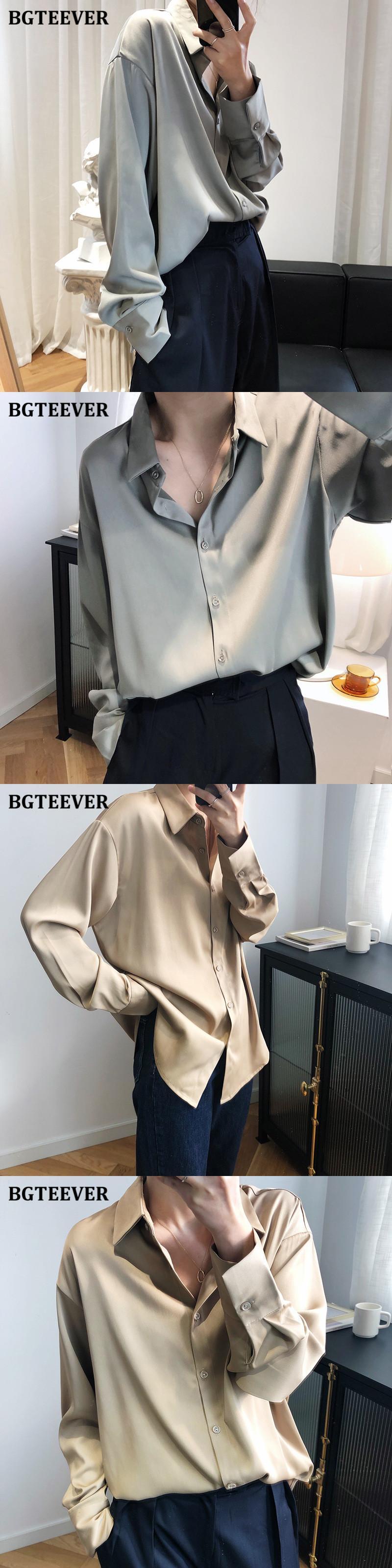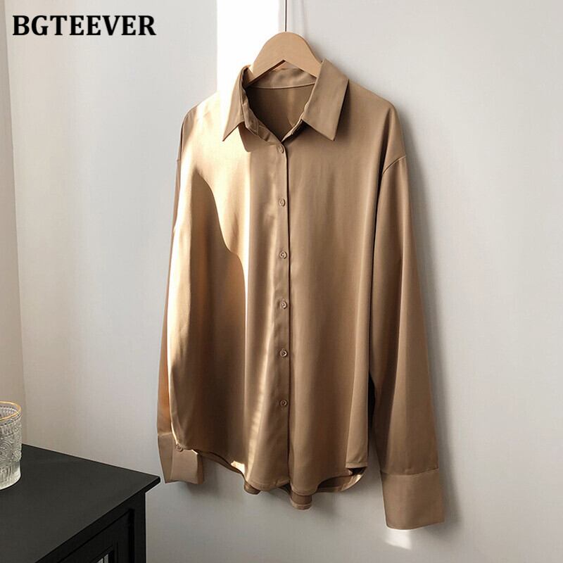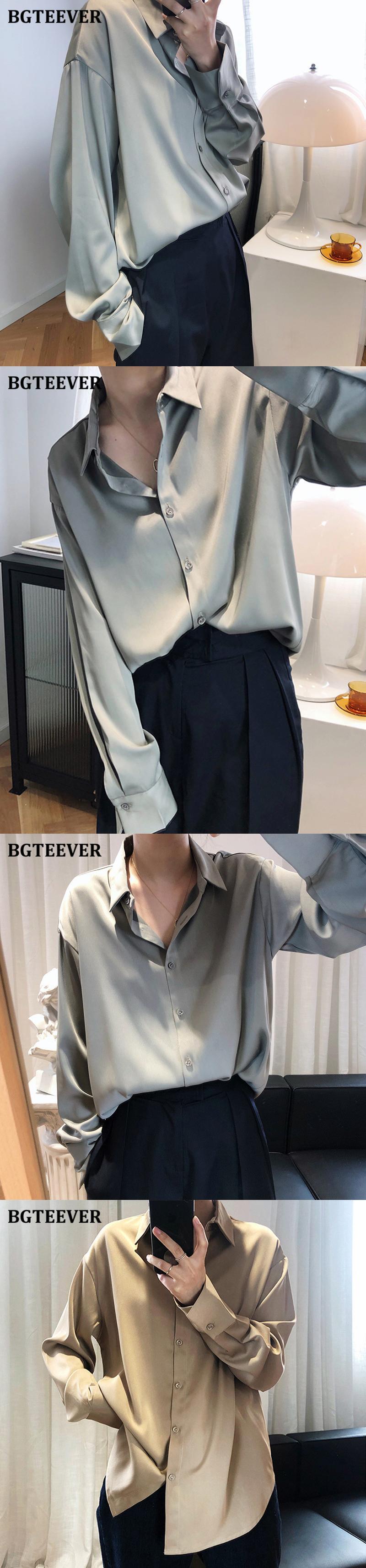【新作】【送料無料】 シックな女性のサテンシャツ長袖ソリッドターンダウンカラーオフィスワークウェアブラウス ロング ソリッドカラー 会社 学校 通勤や通学にも 12b19425824020