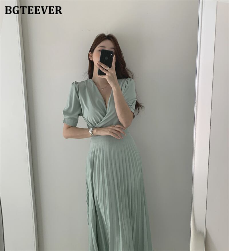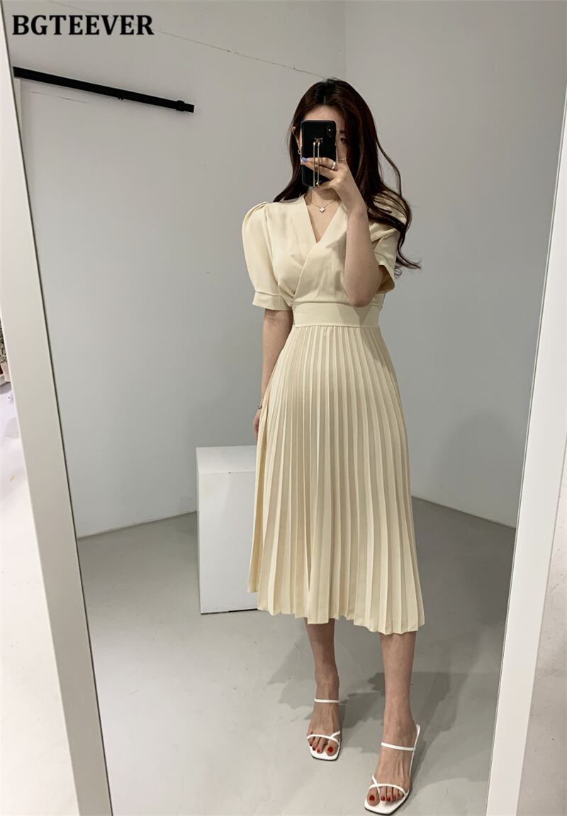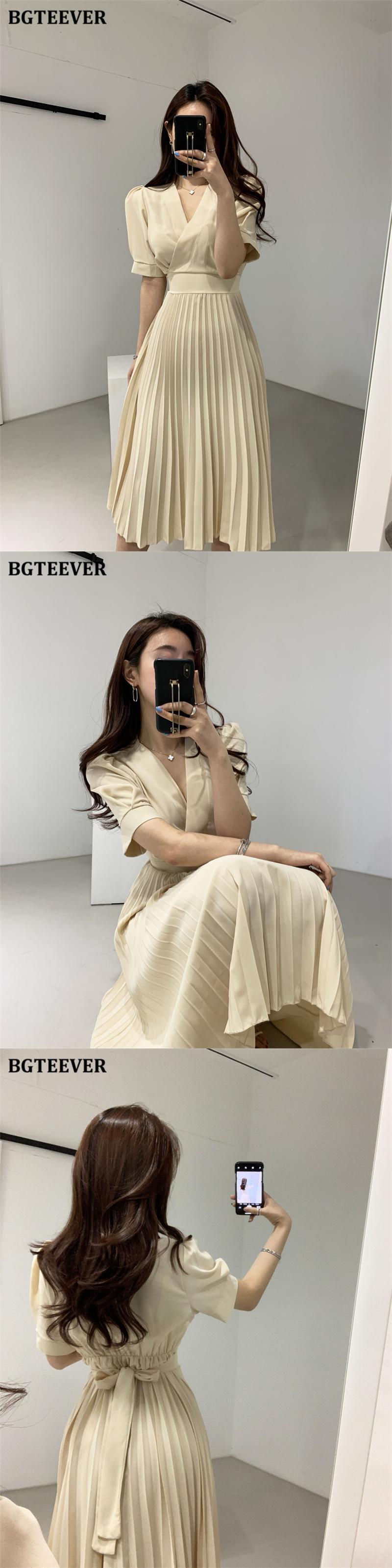 【新作】【送料無料】 BGTEEVER夏秋VネックAラインドレスレディース半袖プリーツドレス2020ミドル丈Vestidos ショート ハーフスリーブ サマー 夏物 オータム 秋物 12b1219390222