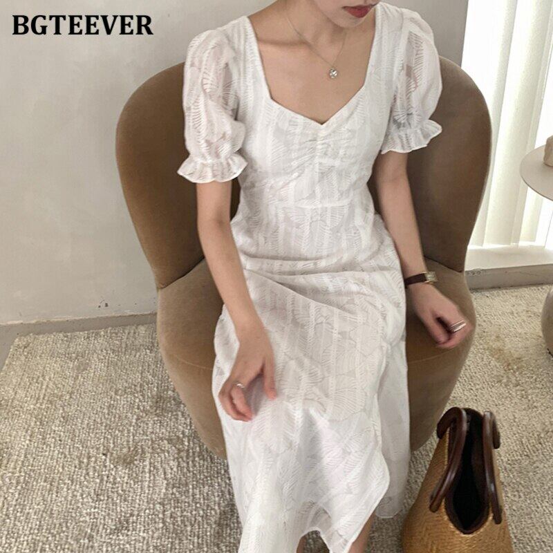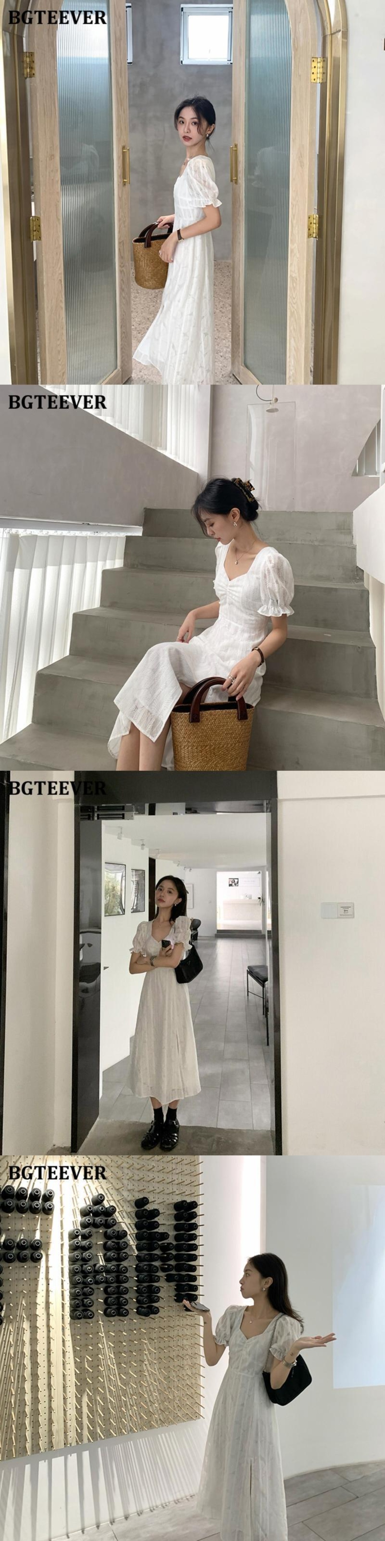 【新作】【送料無料】 BGTEEVERヴィンテージスクエアカラーホワイトドレスレディースサマーパフスリーブスプリットドレス2020フローラルAラインVestidos 夏物 花柄 スクウェア ビンテージ 12b140286733812