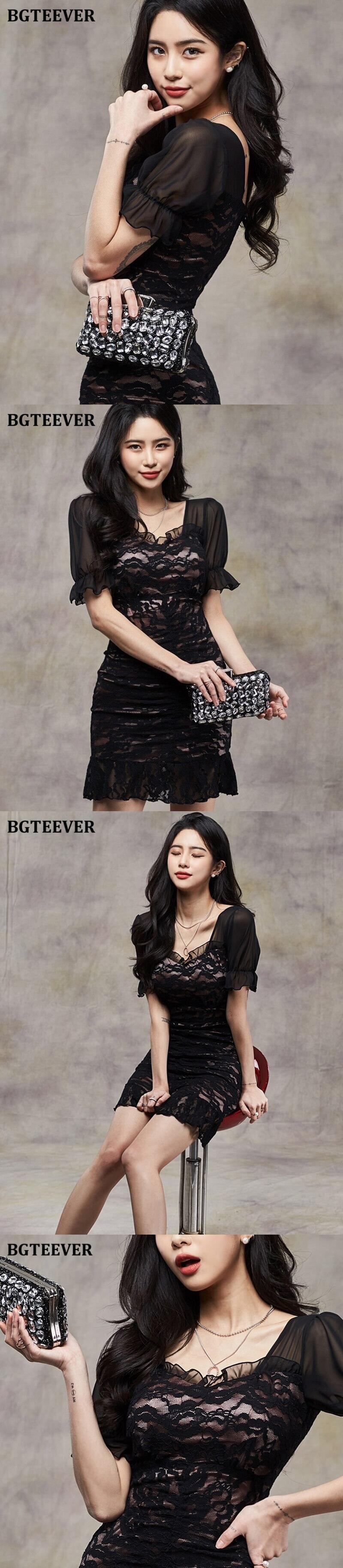 【新作】【送料無料】 BGTEEVERレースパッチワークレディースショートドレススクエアカラースリムミニドレス2020サマーフリルブラックパーティーVestidos ラッフル 夏物 スクウェア 12b14084607182