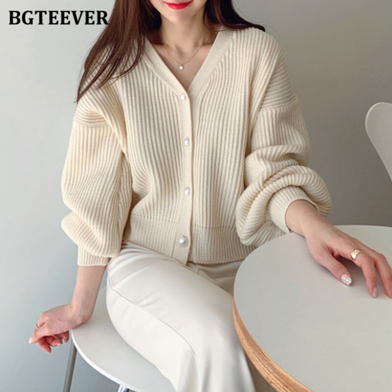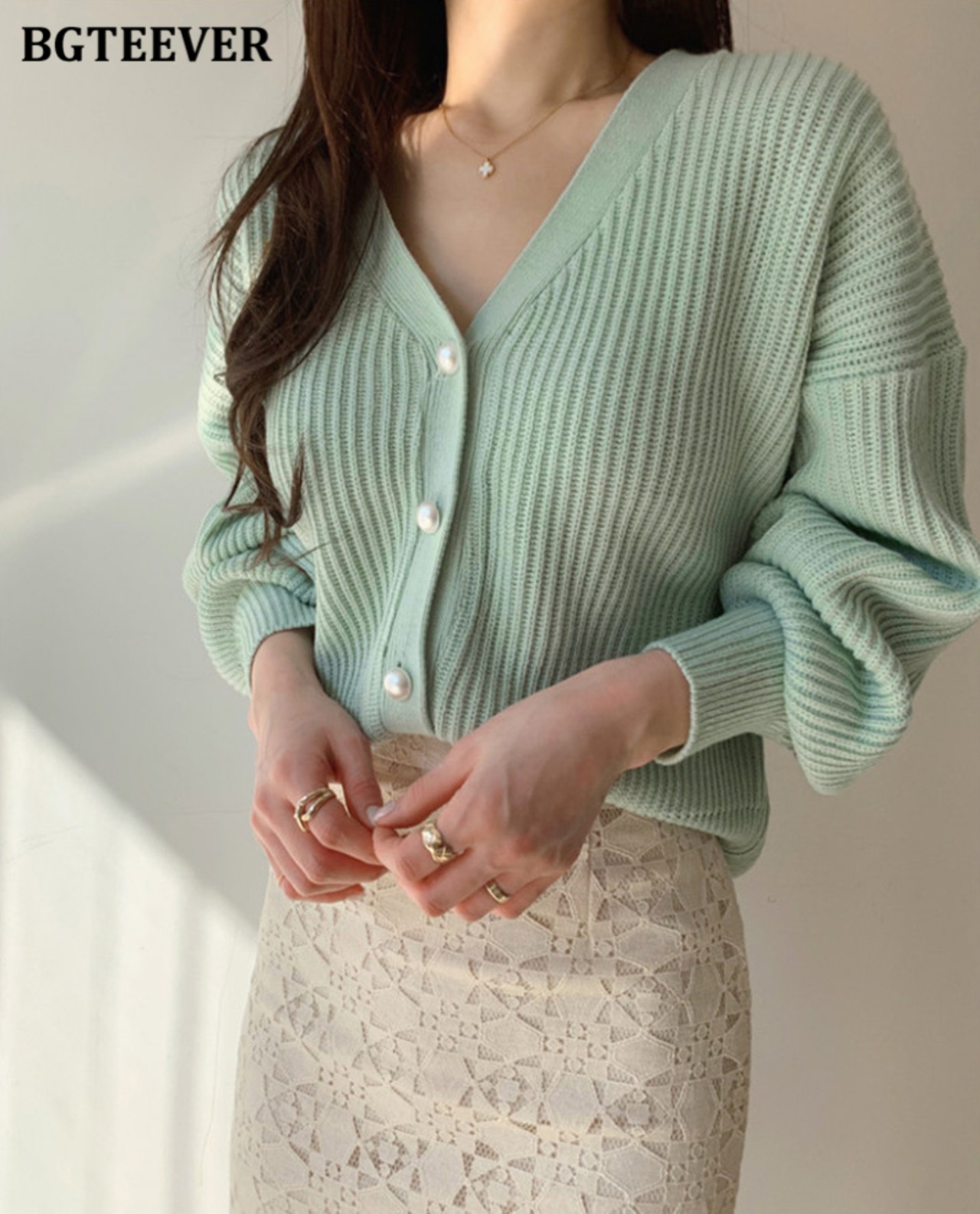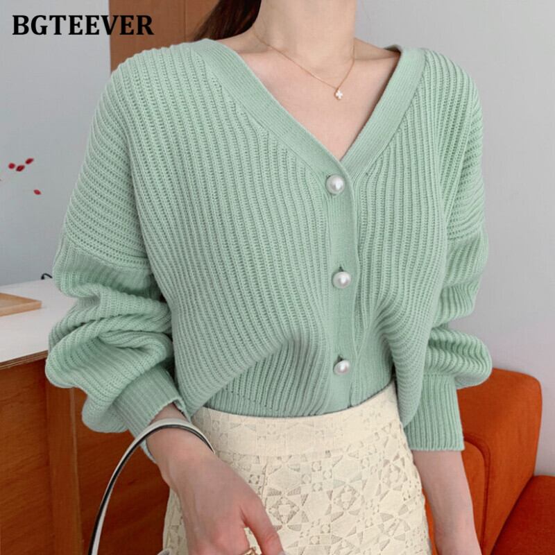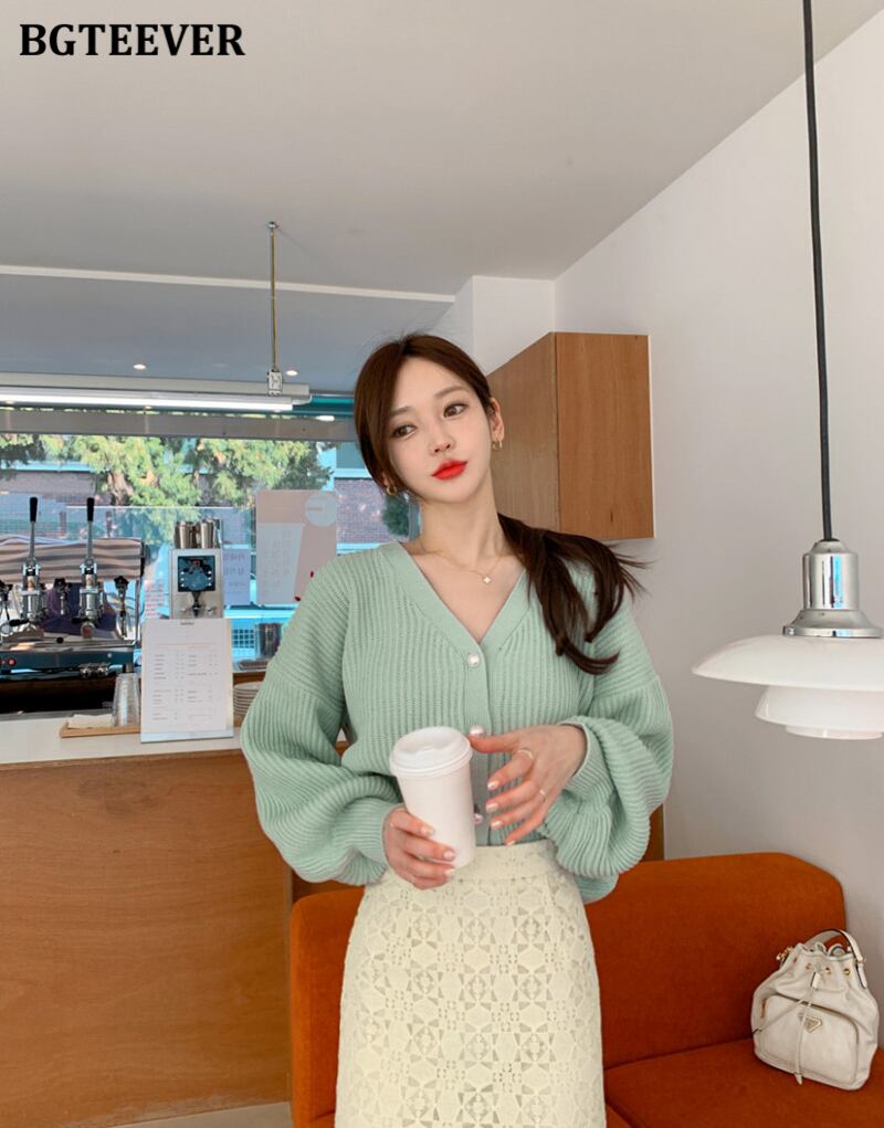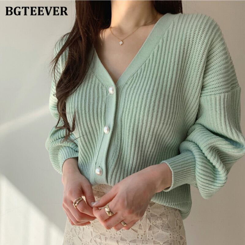 【新作】【送料無料】 BGTEEVERVネックランタンスリーブレディースニットカーディガン2020秋冬ミントグリーンニットオープンステッチジャンパー オータム 秋物 ウィンター 冬物 12b1801936486