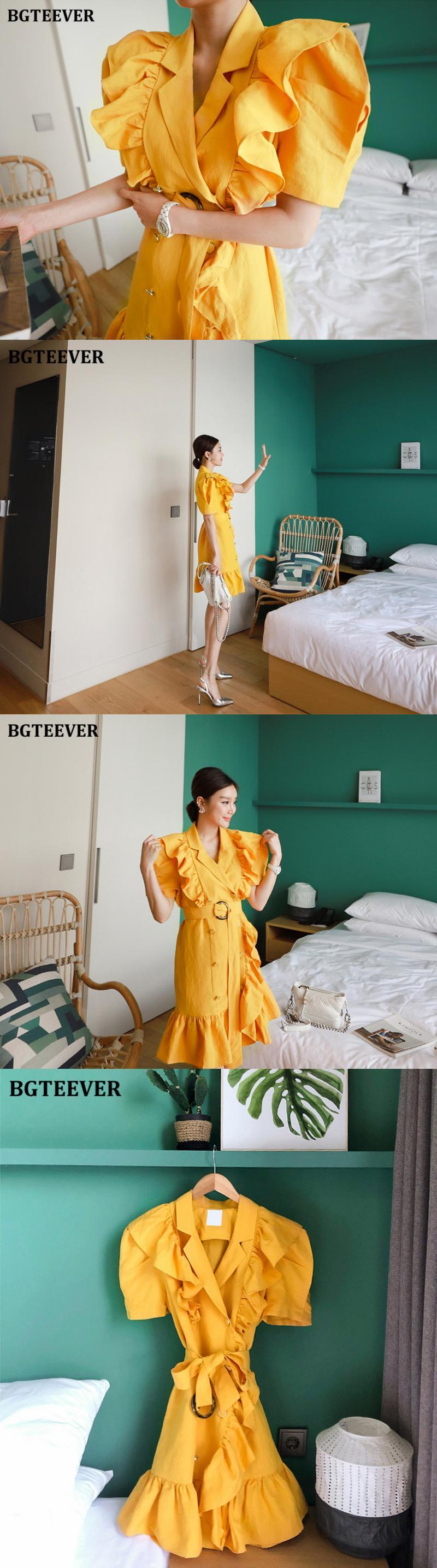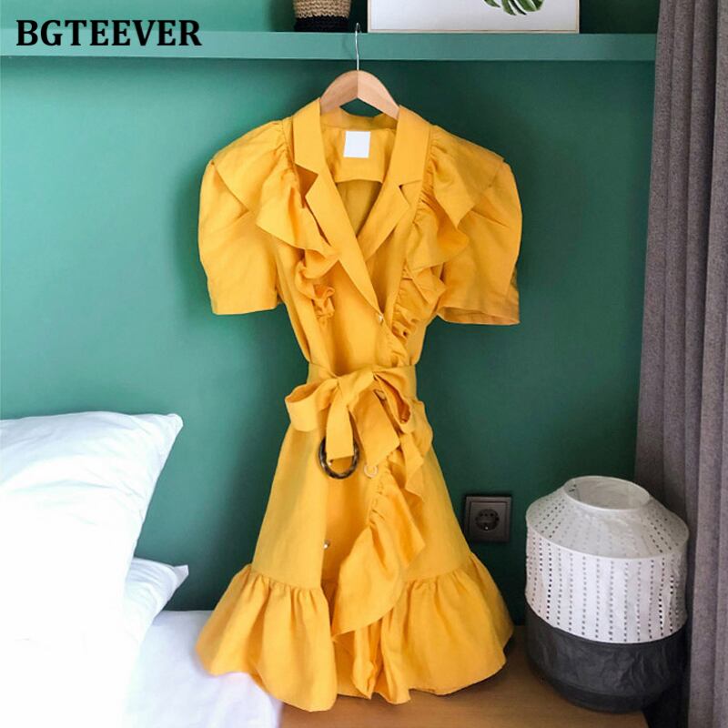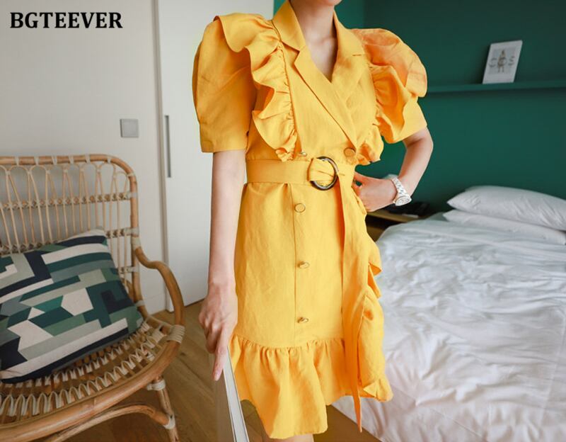 【新作】【送料無料】 BGTEEVERサマーフリルダブルブレストレディーススーツドレスパフスリーブベルト付きルーズドレス2020Meimaid Vestidos femme ラッフル 夏物 ハーネス フェミニン 12b178869285408