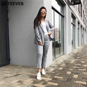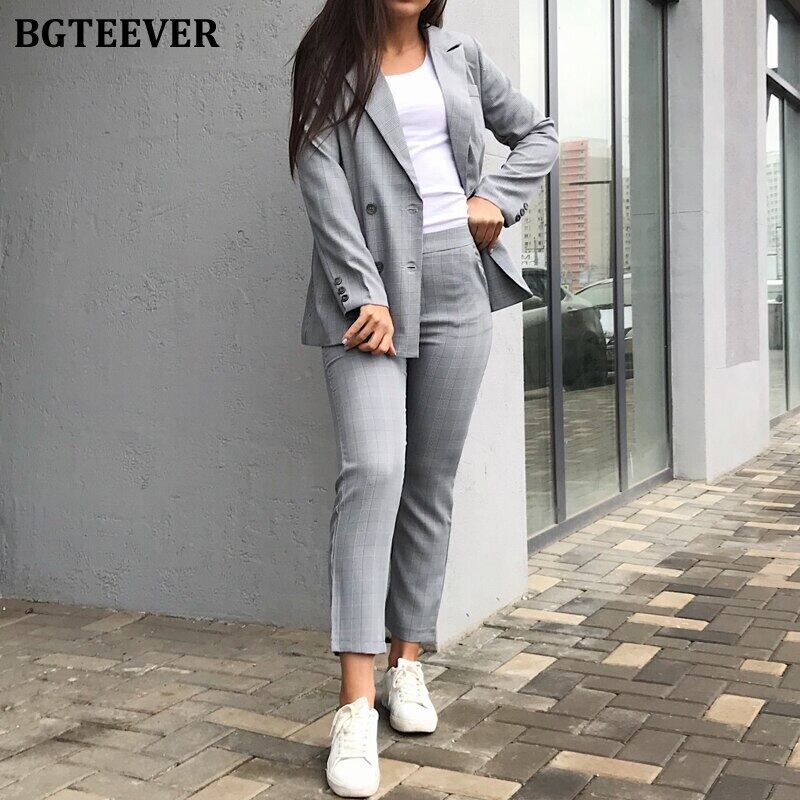 【新作】【送料無料】 BGTEEVERヴィンテージストライプチェック柄2ピースレディースパンツスーツ長袖シングルブレストスーツジャケット&ウエストペンシルパンツ2020 ロング ビンテージ 12b1823716944