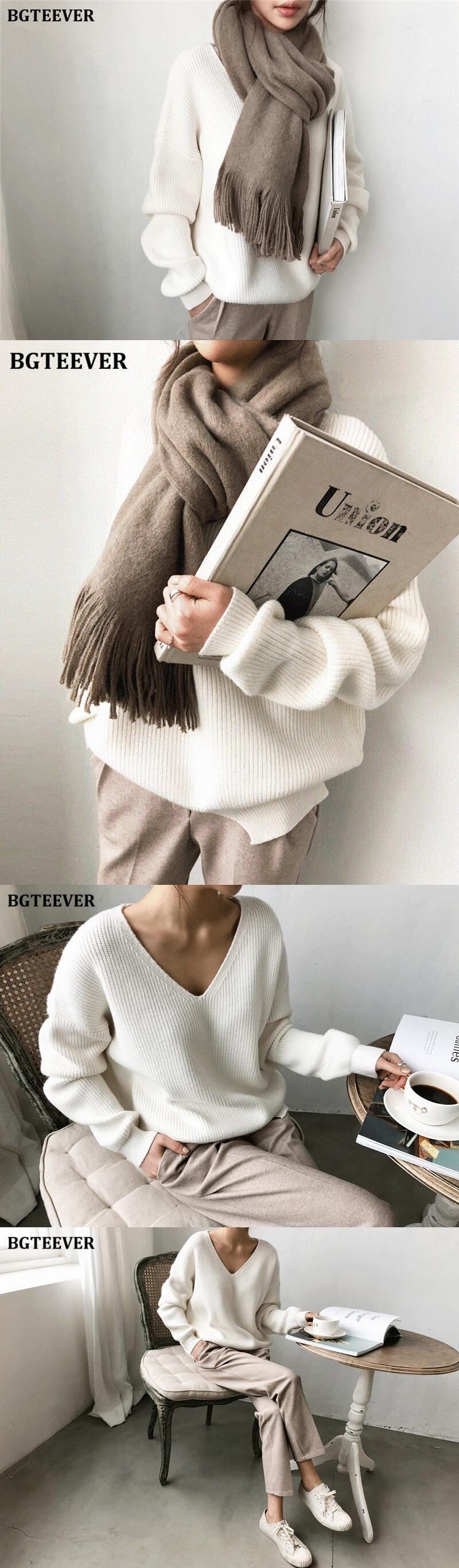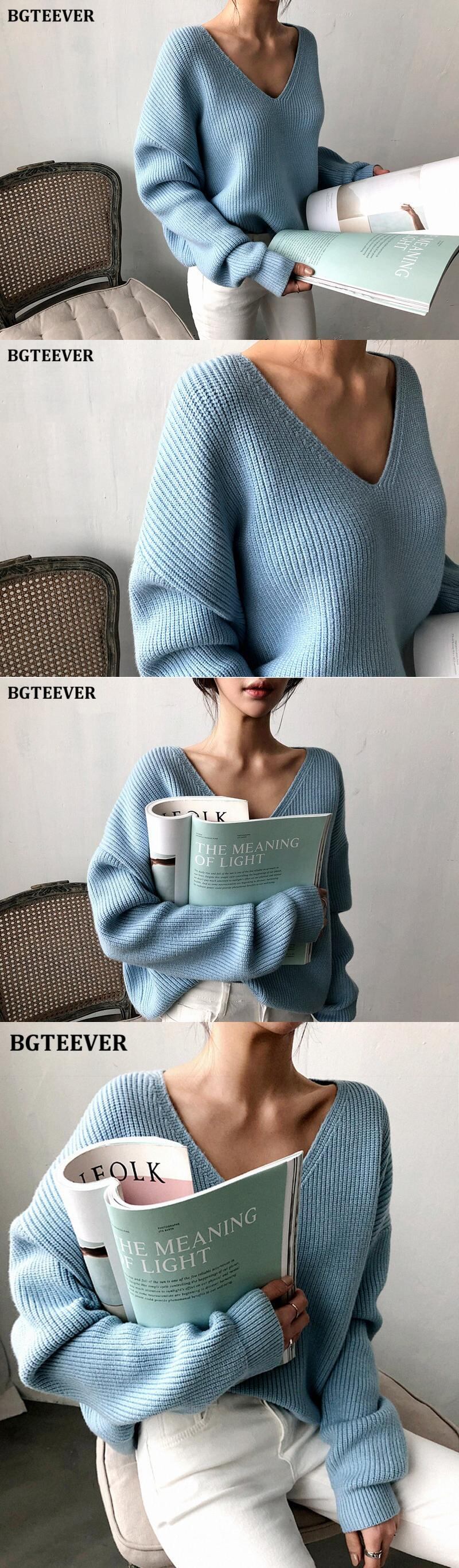 【新作】【送料無料】 BGTEEVERVネック長袖ルースウィミンプルオーバーセーター2020秋冬シックな不規則な裾編みジャンパー ロング オータム 秋物 ウィンター 冬物 12b190262871816