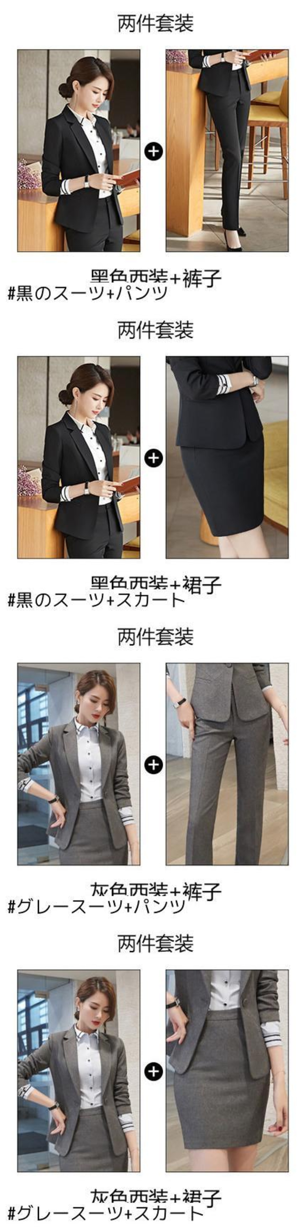 色:黒のスーツ+パンツ,黒のスーツ+スカート,グレースーツ+パンツ,グレースーツ+スカート,黒のスーツ+白のシャツ+パンツ,黒のスーツ+白のシャツ+スカート,黒のスーツ+青のストライプのシャツ+パンツ,黒のスーツ+青のストライプのシャツ+スカート,黒のスーツ+スカート+パンツ,グレーのスーツ+パンツ+青いシャツ,グレーのスーツ+パンツ+スカート,グレーのスーツ+ブルーのストライプのシャツ+パンツ,グレーのスーツ+ブルーのストライプのシャツ+スカート,グレーのスーツ+スカート+青いシャツ