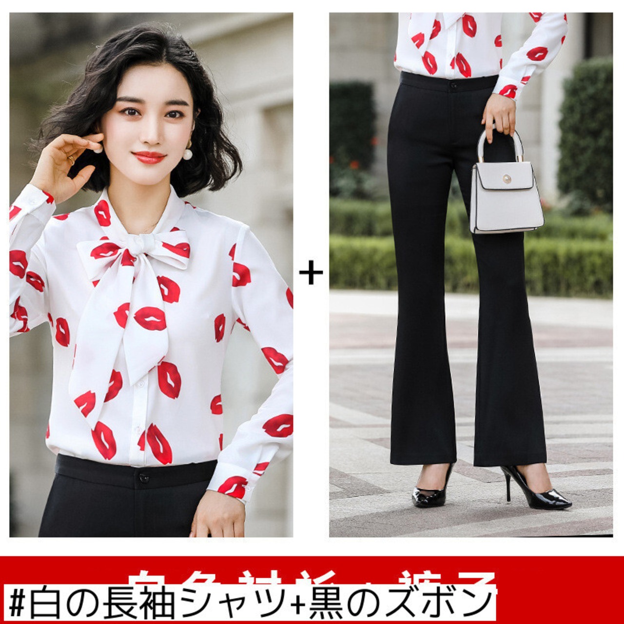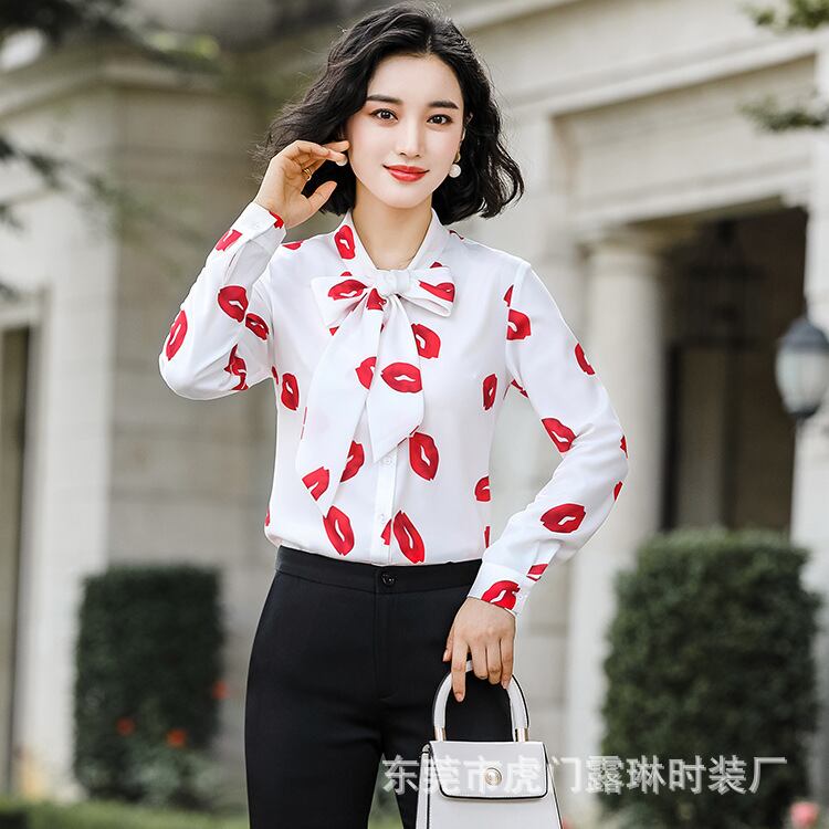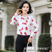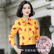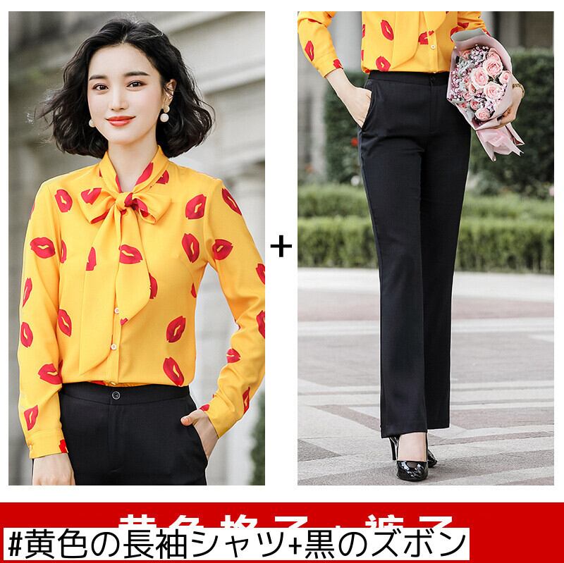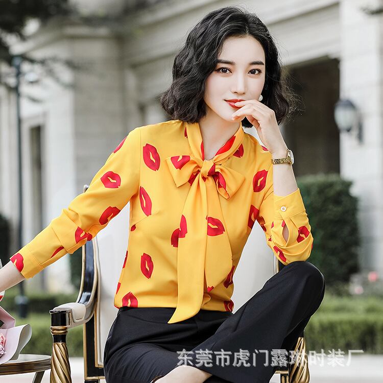 【新作】【送料無料】 黄色いシャツの女性の長袖の印刷秋の新しいデザインセンスオールファッションシャツ気質の弓のトップ-アリババ ロング リボン オータム 秋物 12b327770902314