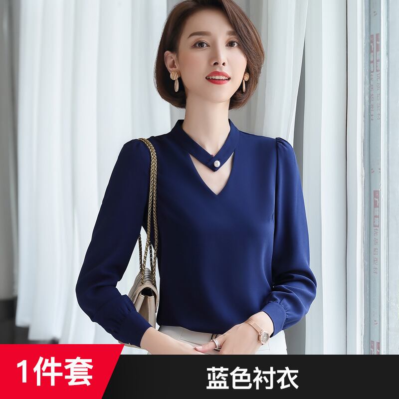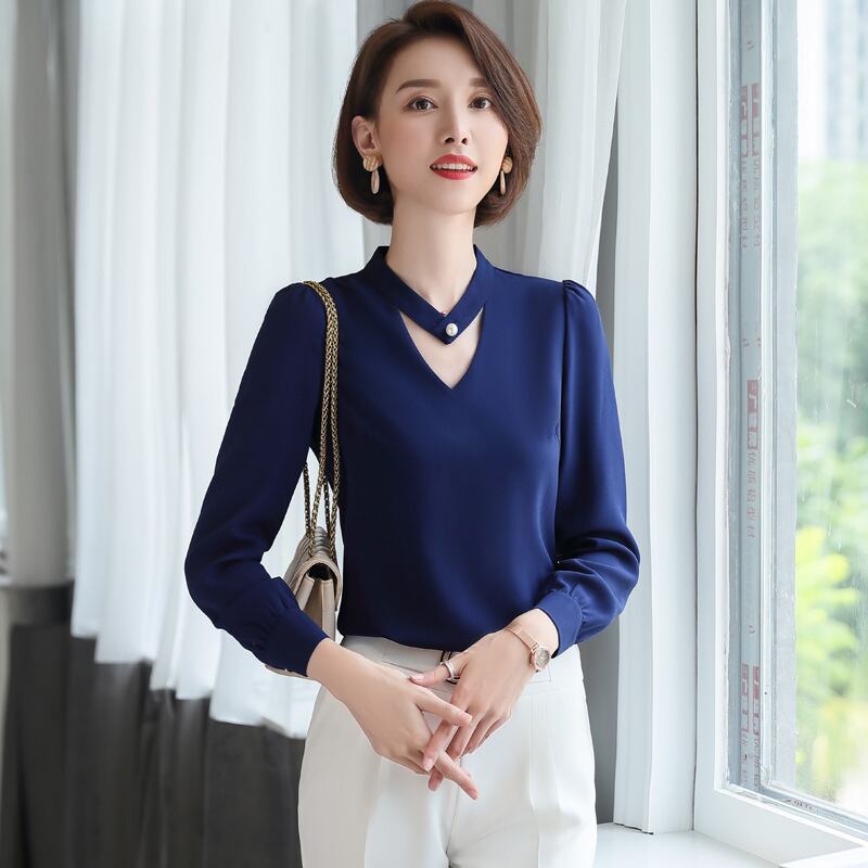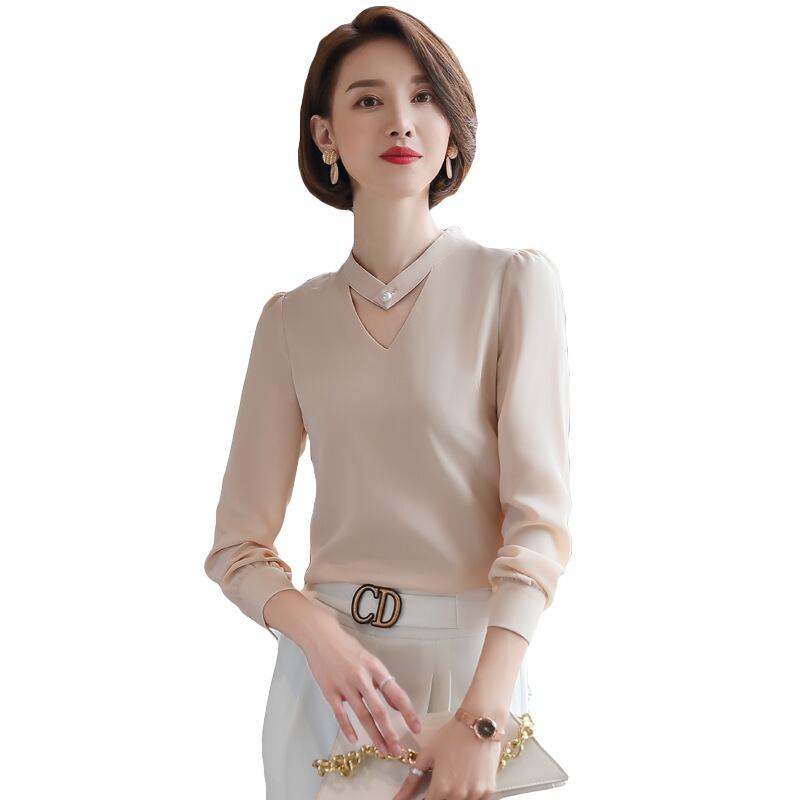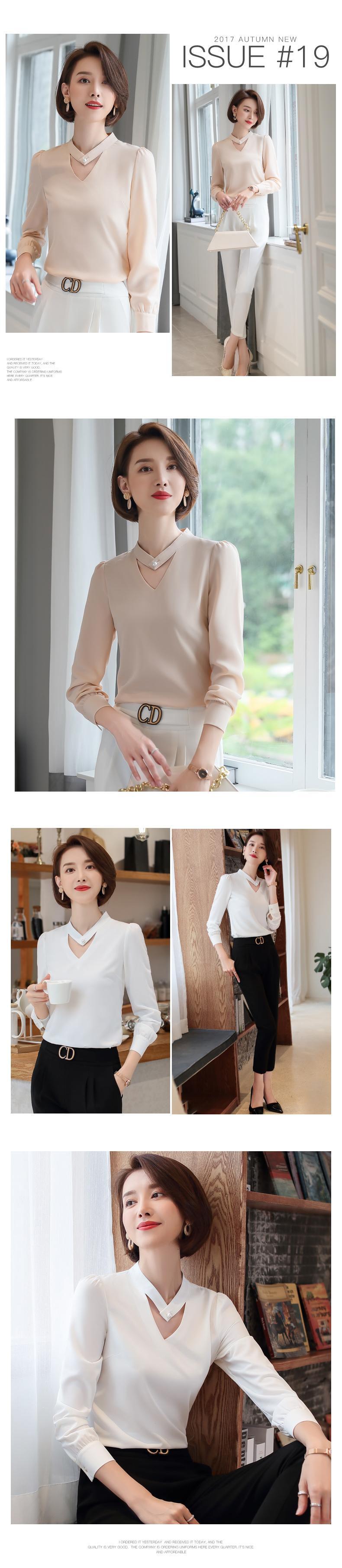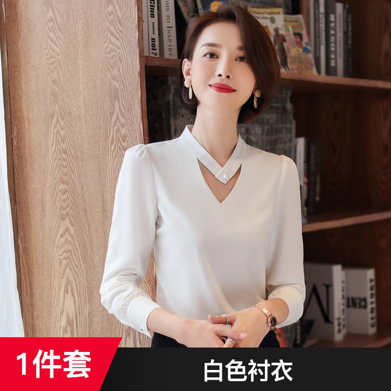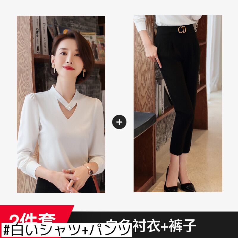 【新作】【送料無料】 プロのシャツ女性バージョン2021新しい秋の長袖シフォントップデザインセンスニッチOLV襟白いシャツ-アリババ ロング ホワイト オータム 秋物 12b388555995255