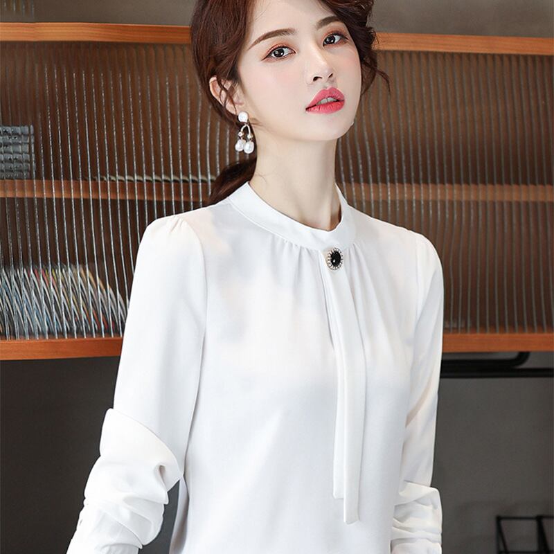 【新作】【送料無料】 2020年秋冬ホワイトシフォンシャツ女性サテンルックスタンドアップカラーインタビューマルウェアプロ長袖オーバーオールシャツ-アリババ ロング ウィンター 冬物 12b337809287425
