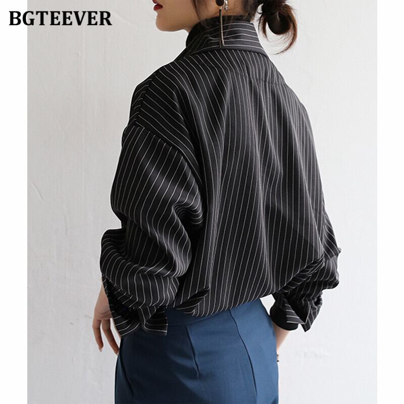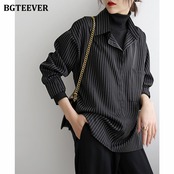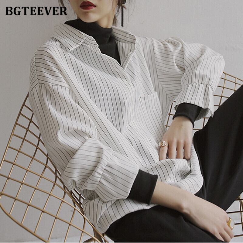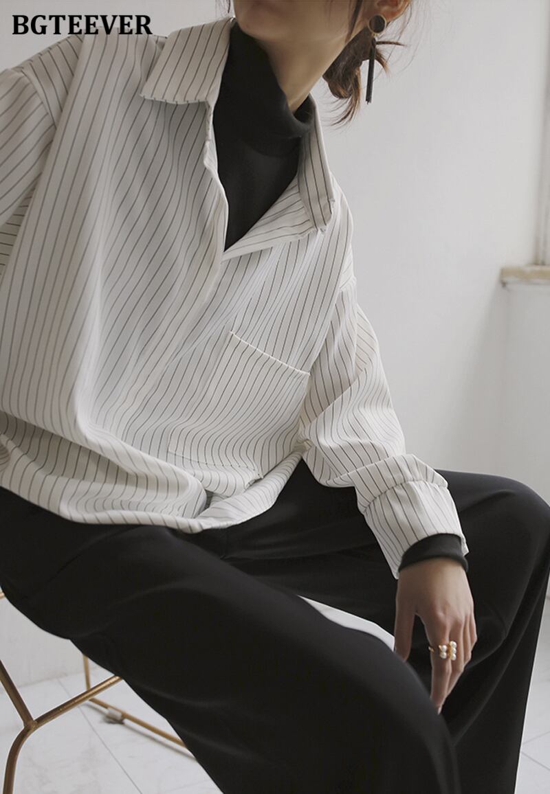 【新作】【送料無料】 BGTEEVERスタイリッシュなフェイク2ピースレディースストライプブラウスタートルネックフルスリーブルーズスプリングシャツワークウェアトップスファム2021 春物 フェミニン 12b113032407385