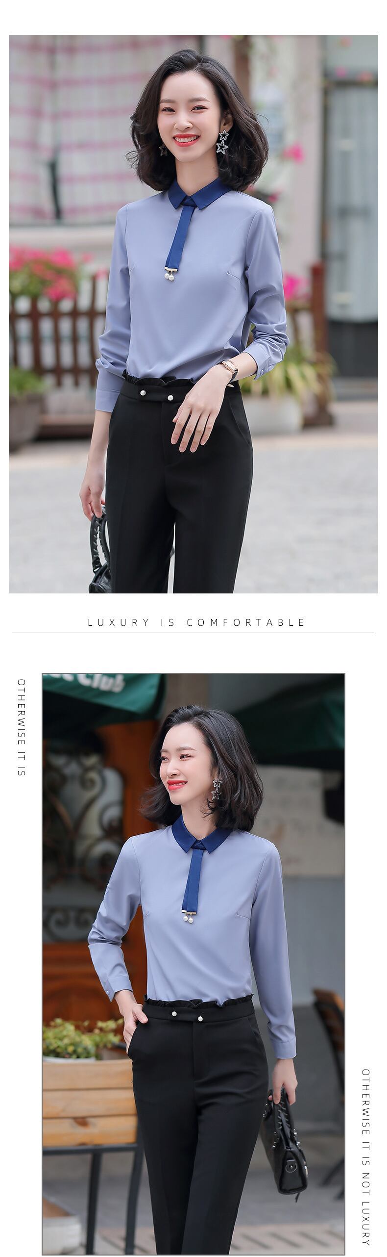 色:青とグレーのシャツ,2点セット(青とグレーのシャツ+黒のクロップドパンツ)