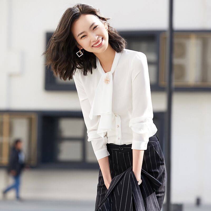 【新作】【送料無料】 ネクタイシャツ女性デザインセンスニッチエインスタイルトップス秋冬スタイルルーズ長袖プロオールシフォンホワイトシャツ-アリババ ロング オータム 秋物 ウィンター 冬物 12b378402031184