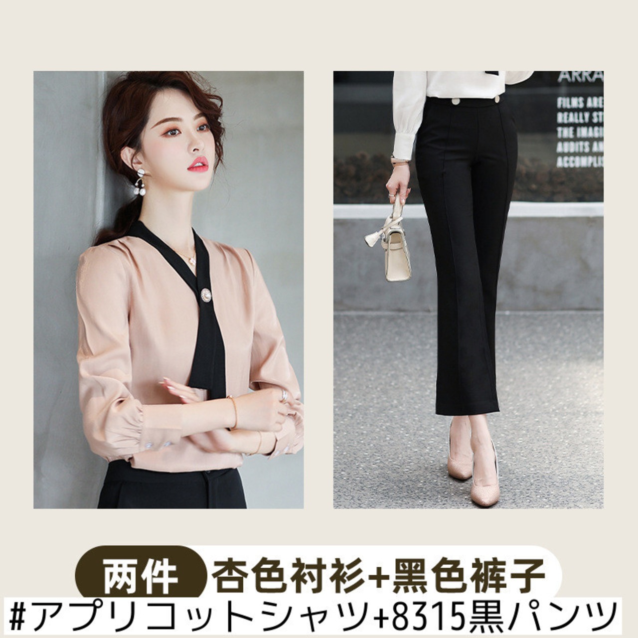 色:白のシャツ,白いシャツ+8315黒いズボン,アプリコットシャツ,アプリコットシャツ+8315黒パンツ