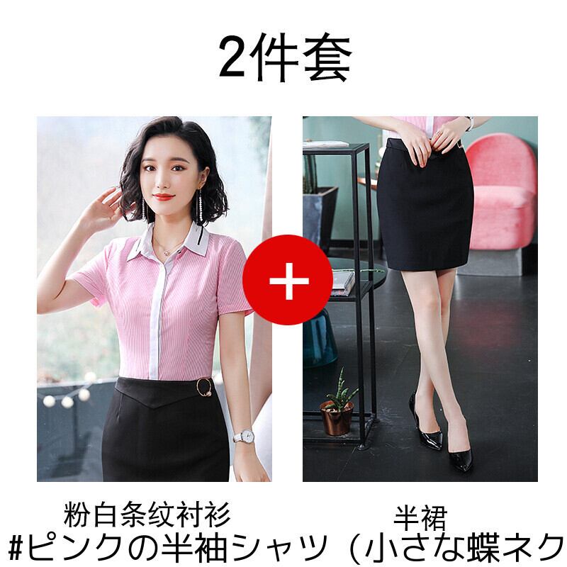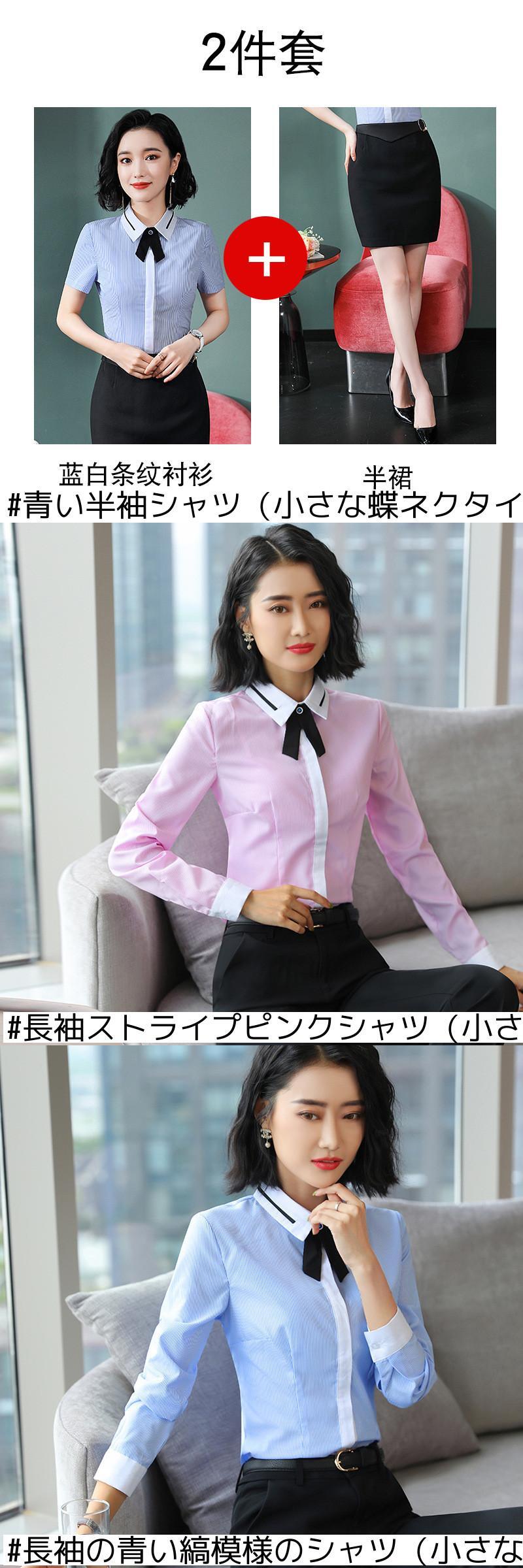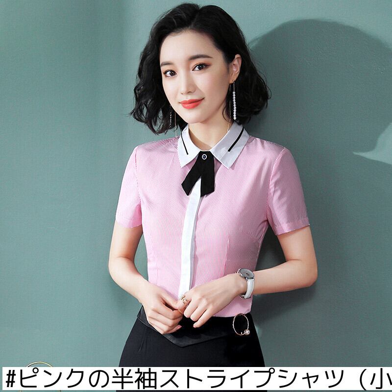 【新作】【送料無料】 半袖ストライプシャツ女性作業服夏プロウェアオールボウタイシャツマルウェアエルフロントデスク作業服-アリババ リボン サマー 夏物 12b336807630189
