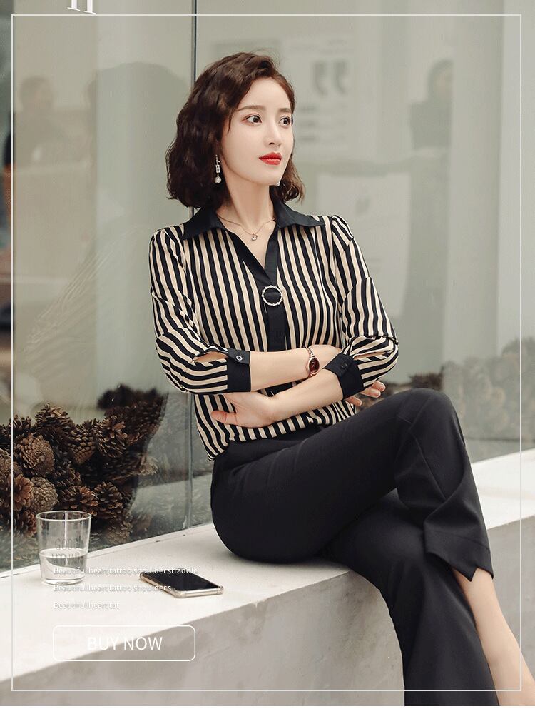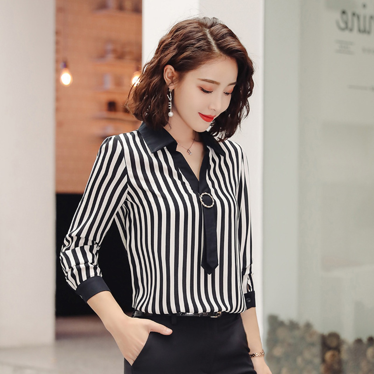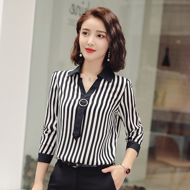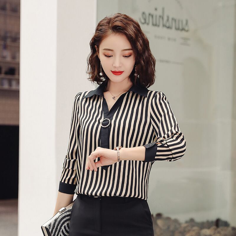 【新作】【送料無料】 2019シフォンストライププロ長袖シャツ女性新しいカジュアルルーズ秋七分袖女性用シャツ-アリババ ロング オータム 秋物 12b31747685641