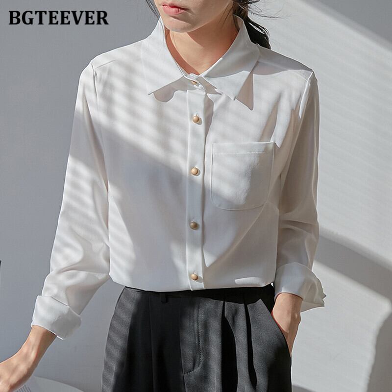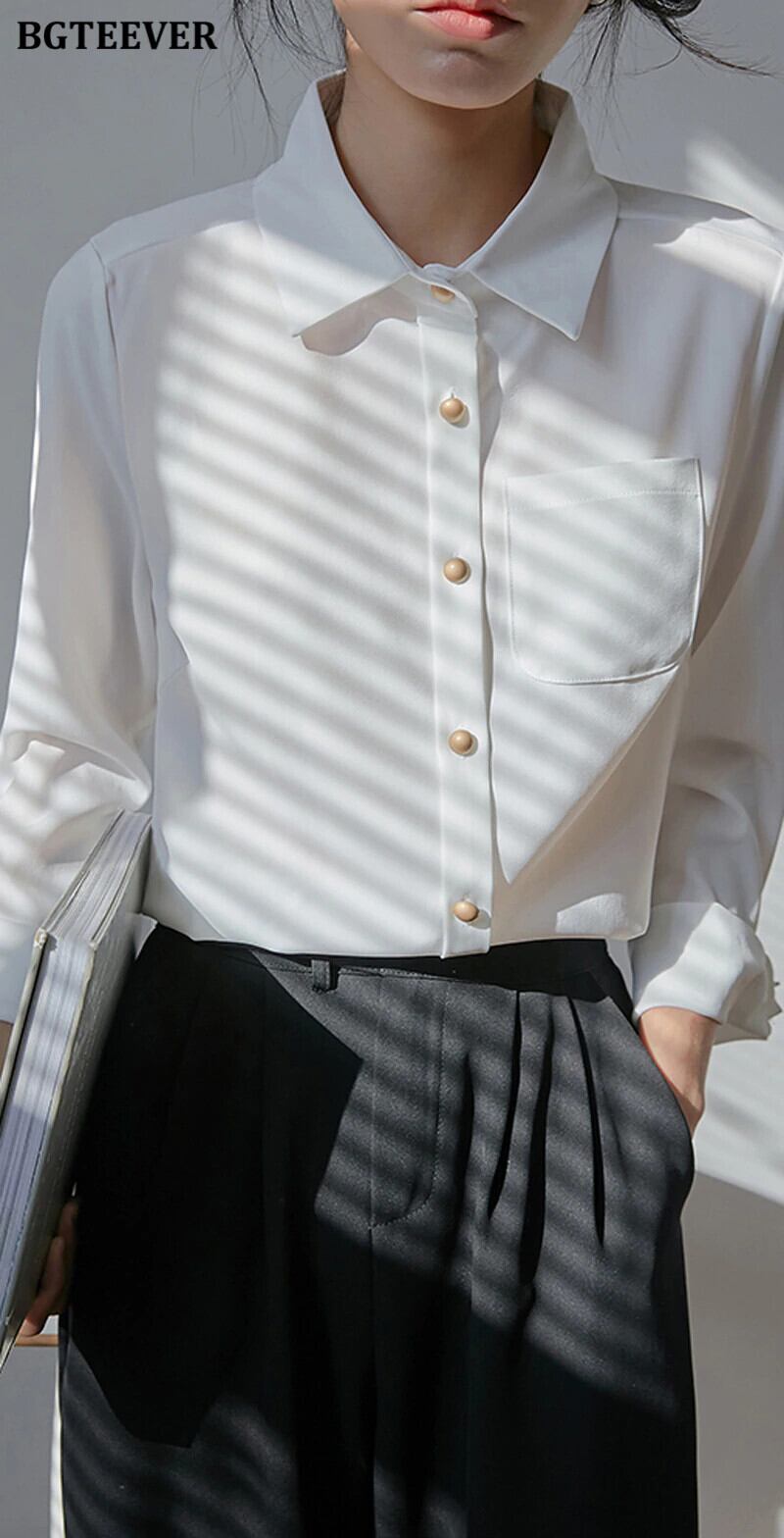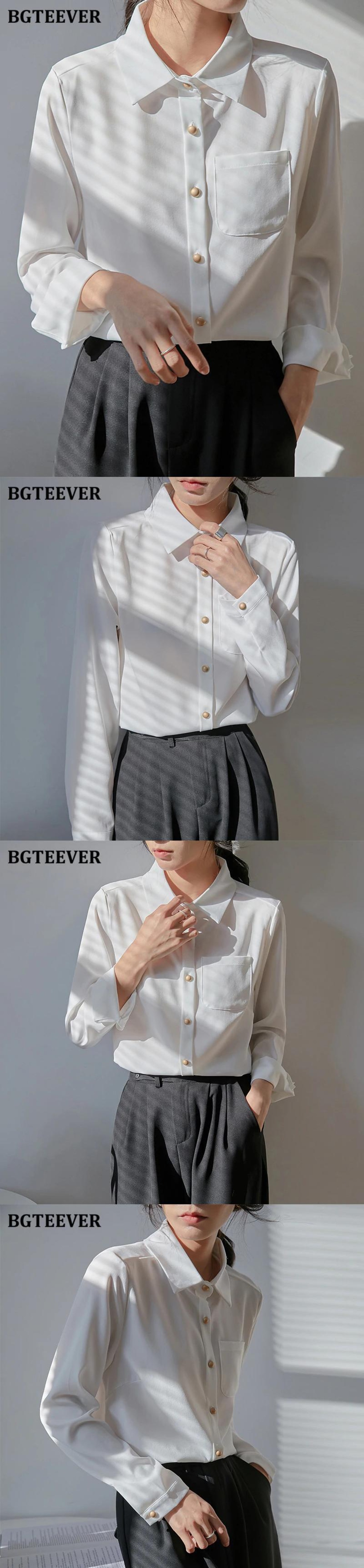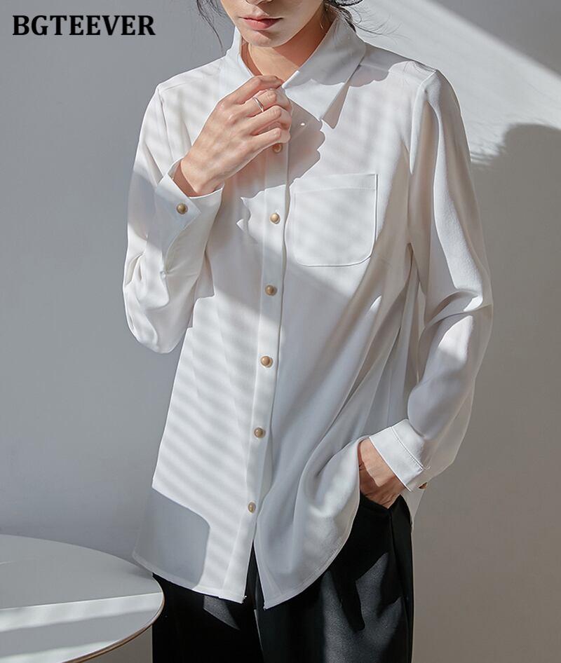 【新作】【送料無料】 BGTEEVER春OL白シャツ女性ルーズラペルワンポケットブラウストップス作業服2021 ホワイト スプリング 春物 12b112209085634