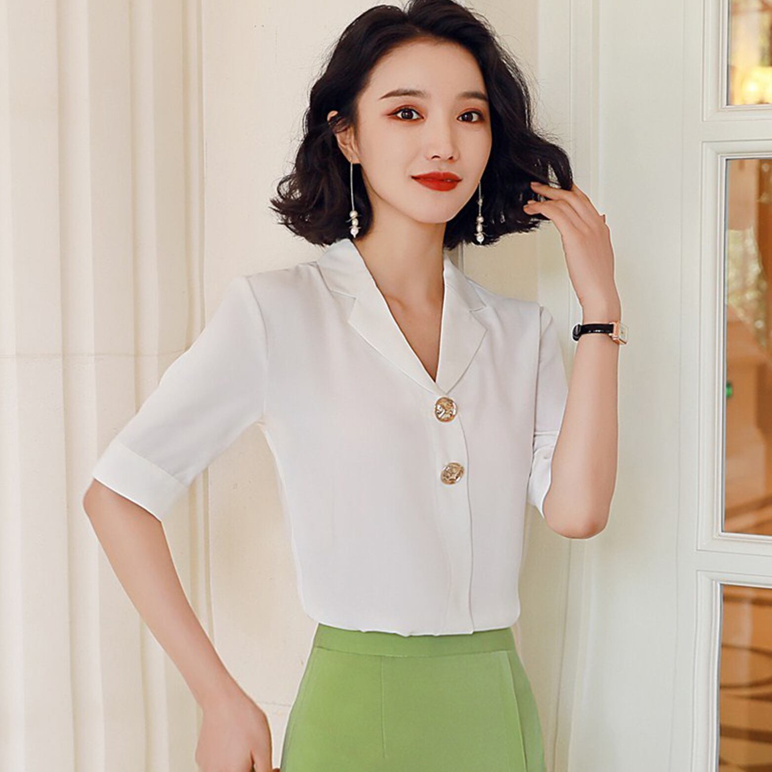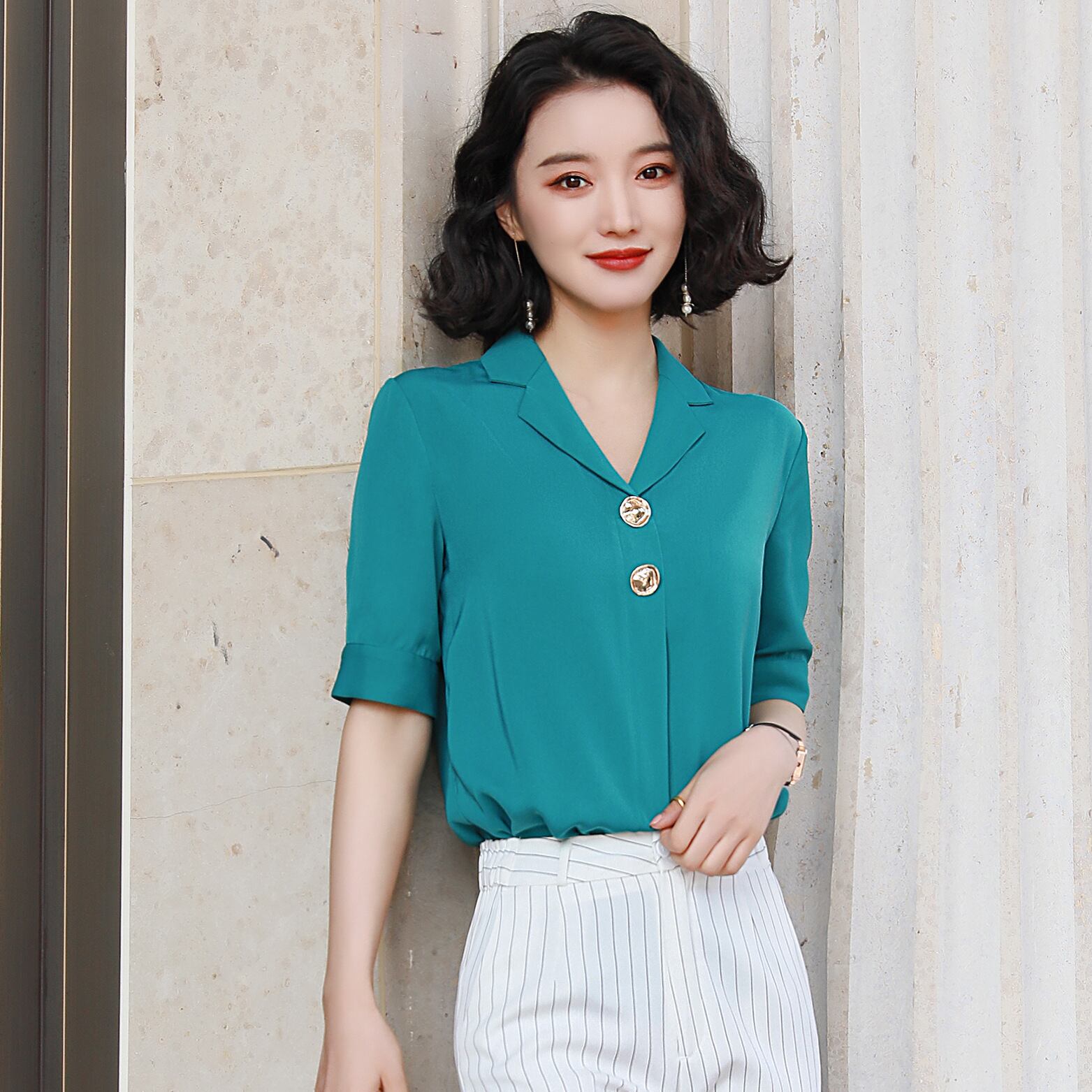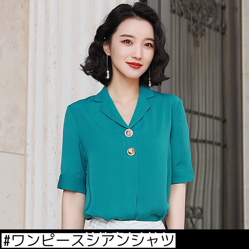 【新作】【送料無料】 2020年春の新しいルーズホワイトカラースーツカラーシフォンホワイトシャツ女性半袖スタイルの薄いウエスタンシャツ夏-アリババ スプリング 春物 サマー 夏物 12b348367719060
