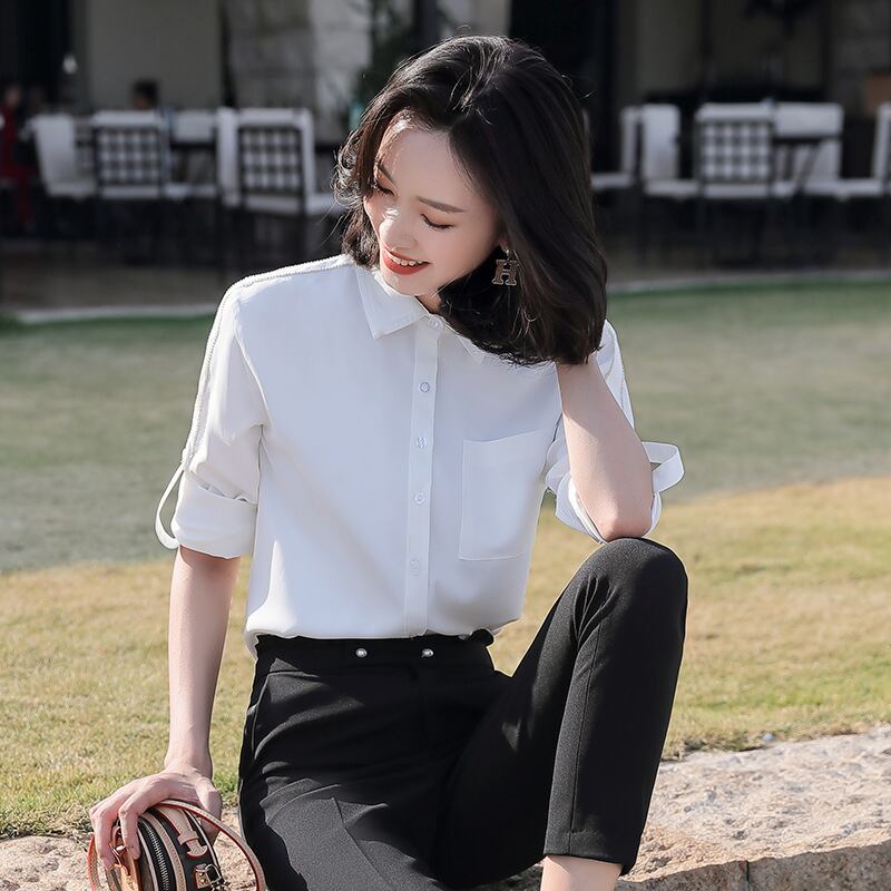 【新作】【送料無料】 ホワイトスクエアカラーシフォン長袖シャツプロホワイトカラープレジデントベースコート2020春夏新作レディーストップス-アリババ ロング スプリング 春物 サマー 夏物 スクウェア 12b333259123149