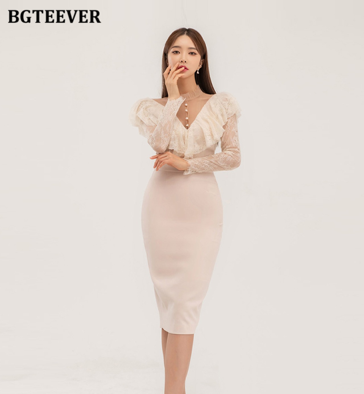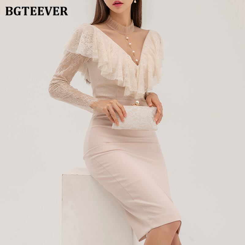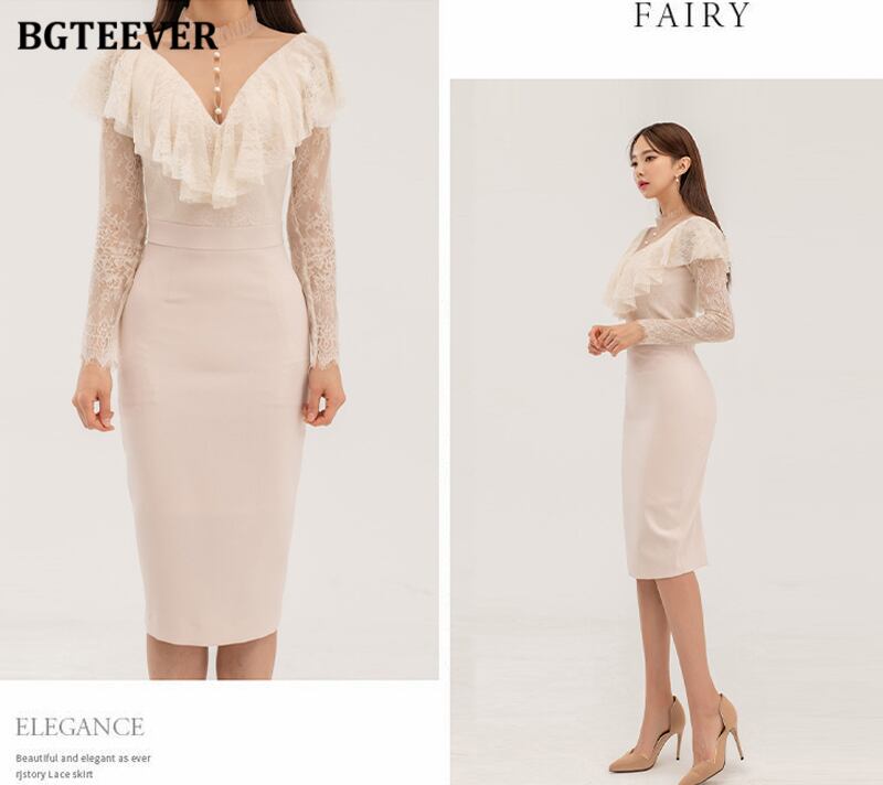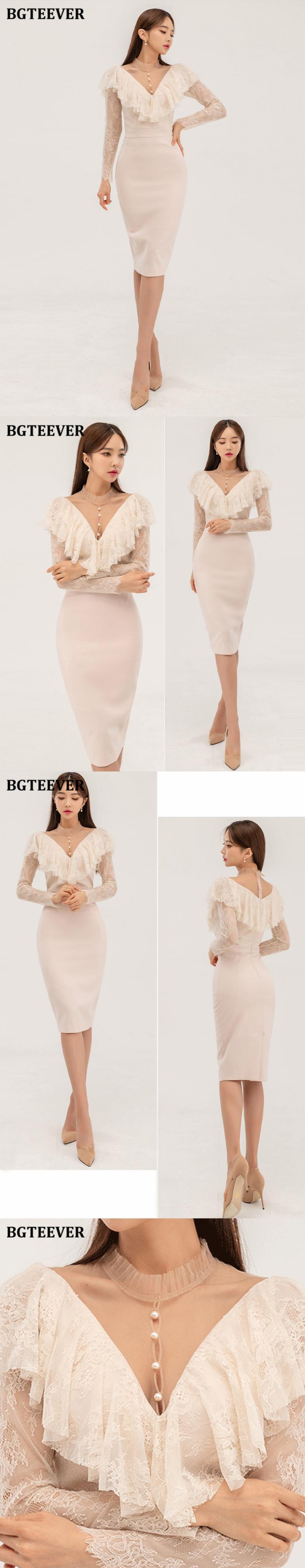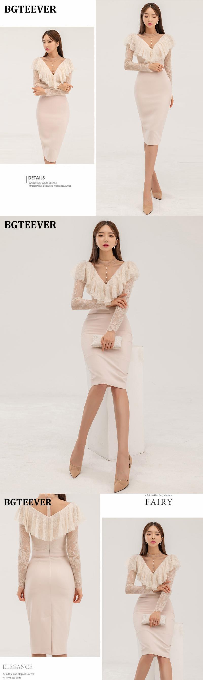 【新作】【送料無料】 BGTEEVERシックなVネックの女性のレースパッチワークボディコンドレスフルスリーブスリムパッケージヒップドレス春のスプリットVestidos スプリング 春物 12b125193357072