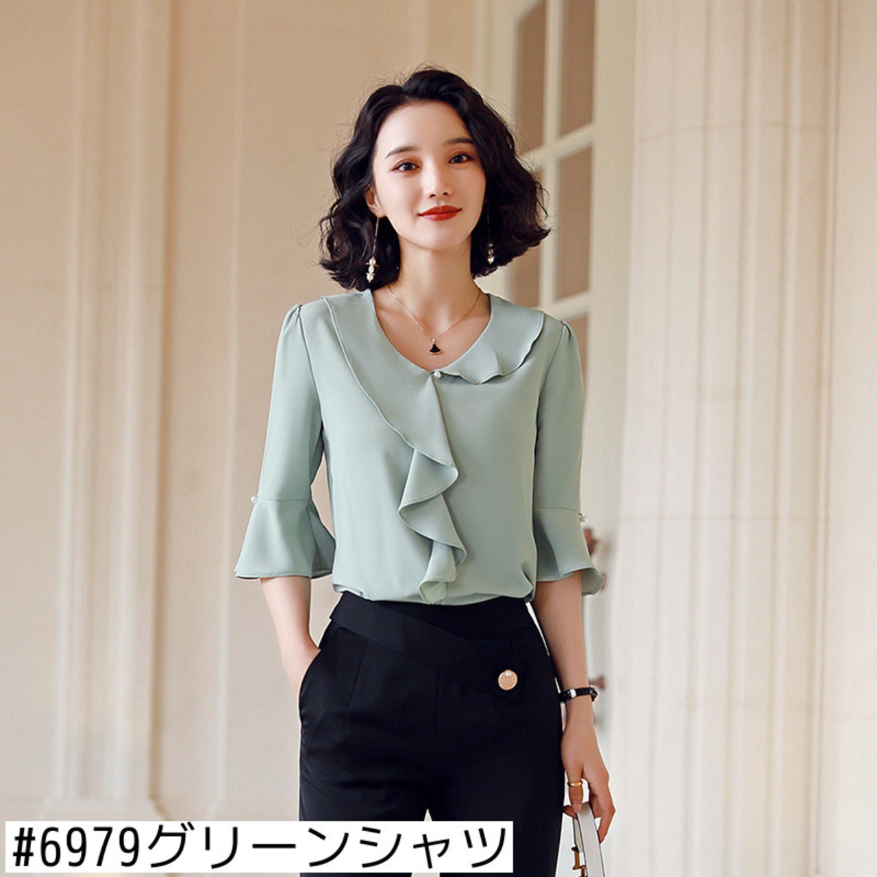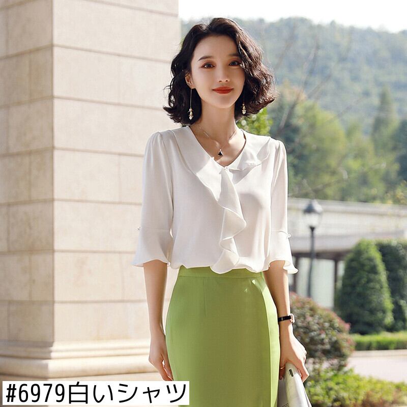 【新作】【送料無料】 2020年夏の新しい女性のフレアスリーブフリルVネックプルオーバーミドルスリーブホワイトシフォンシャツプロフェッショナルトップ-アリババ レッド サマー 夏物 12b33632754397