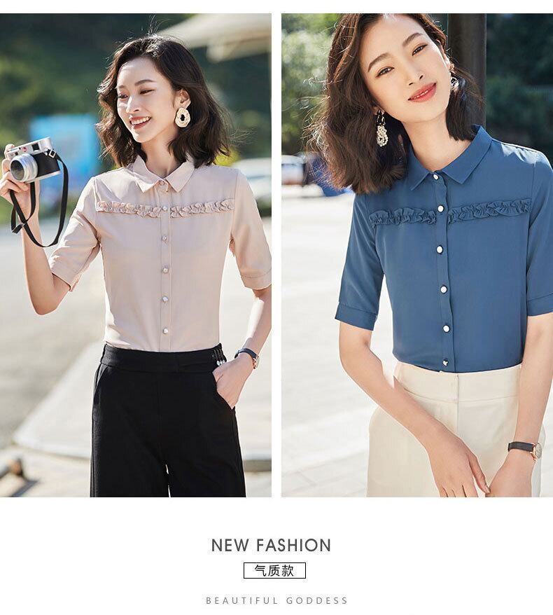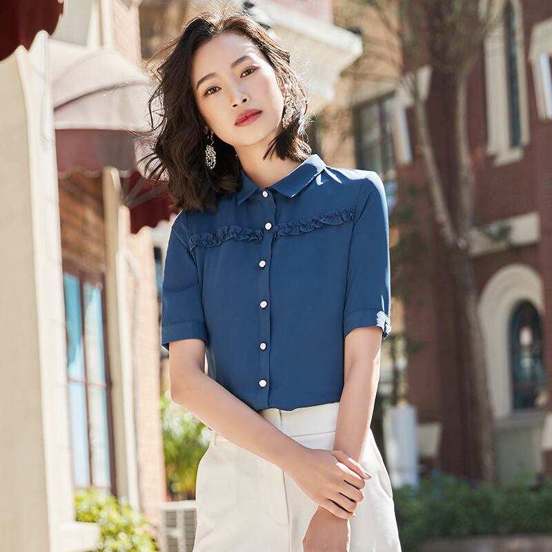 【新作】【送料無料】 ブルースクエアカラーシングルブレストミドルスリーブシャツ2020夏の新しい女性のマルウェアレースステッチビジネスコミュータートップ-アリババ サマー 夏物 スクウェア 12b341014672506