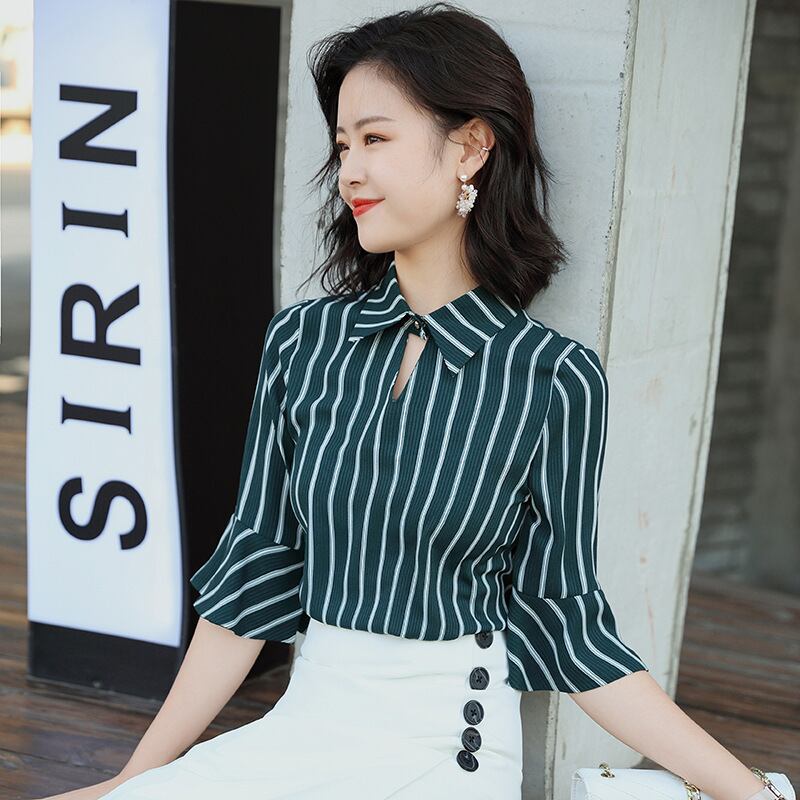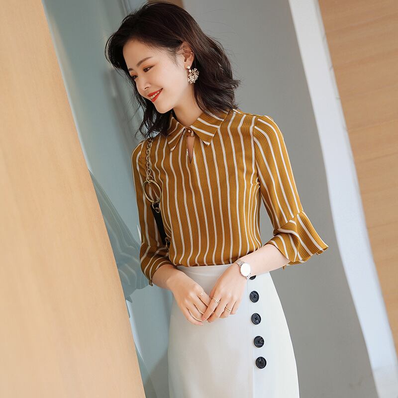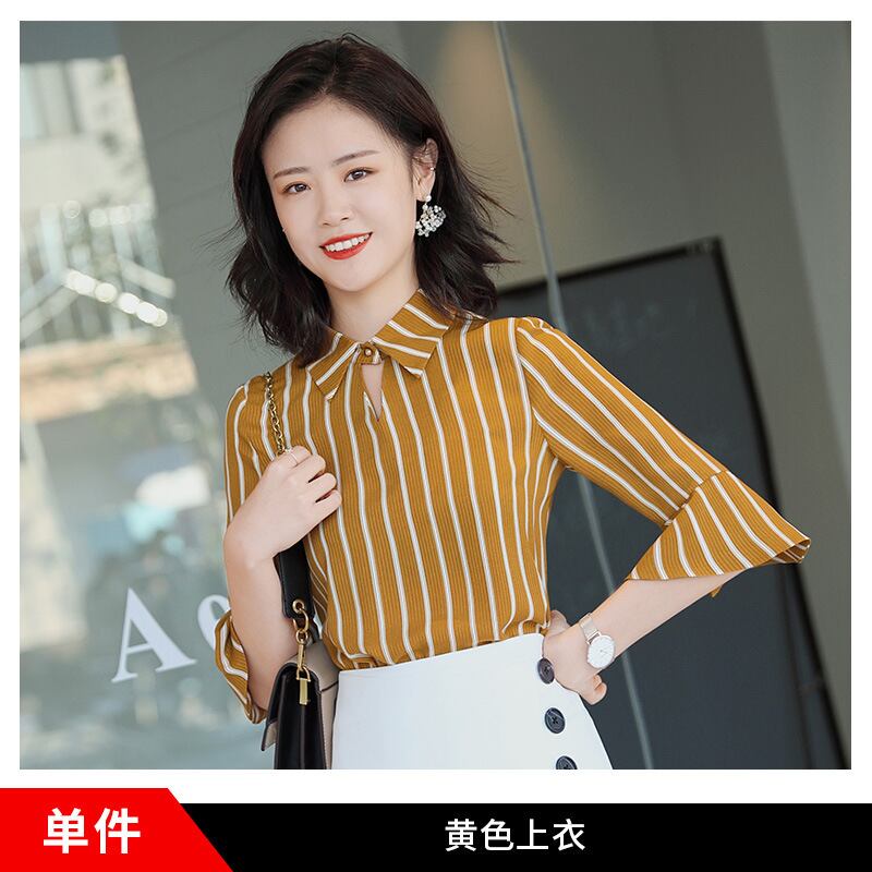 【新作】【送料無料】 ストライプミドルスリーブシャツトップハーフレングススカートスーツレディース2020夏新作レディースカジュアルネットレッドツーピーススーツ-アリババ サマー 夏物 12b344478533599