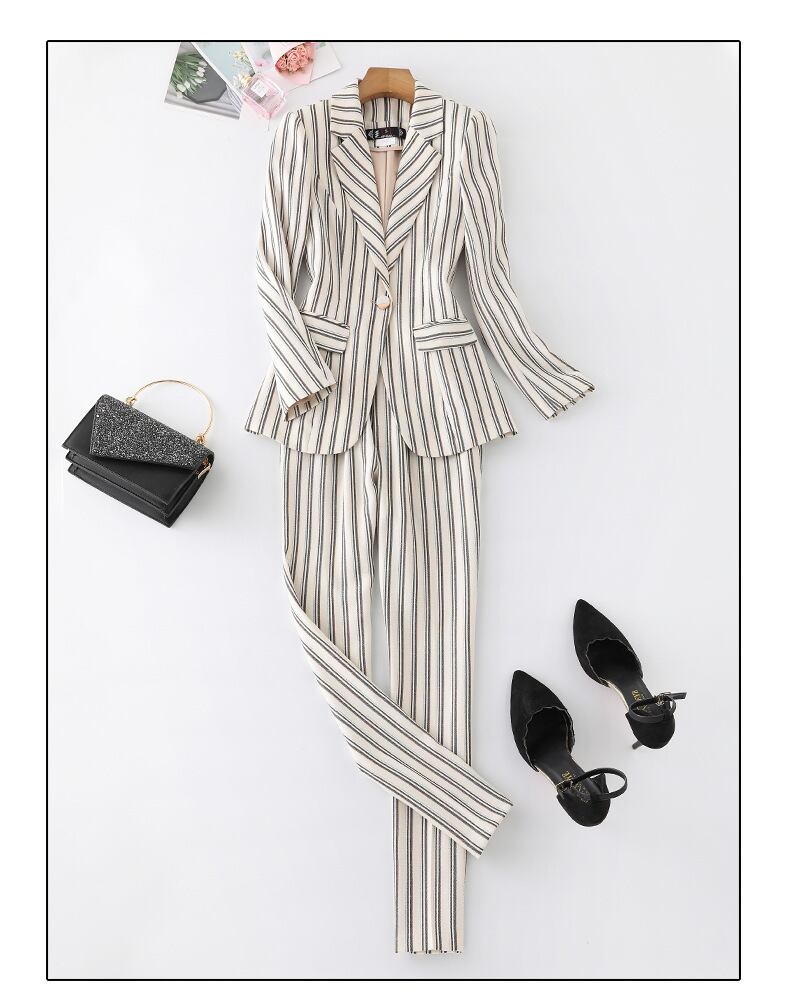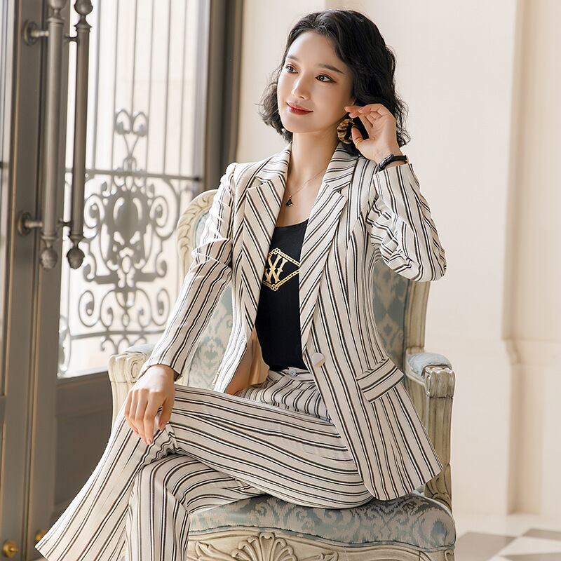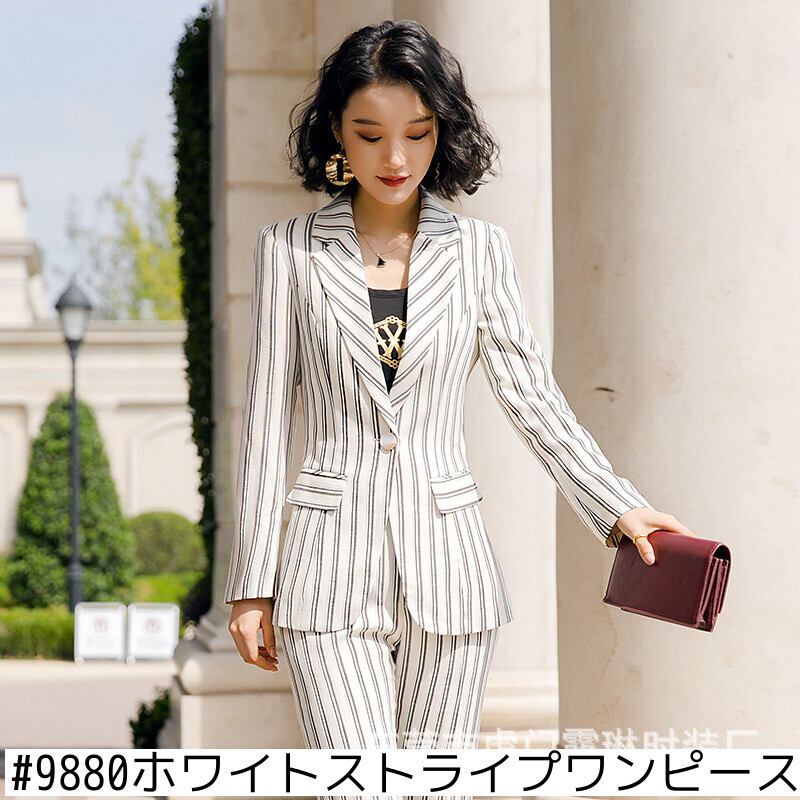 【新作】【送料無料】 プロの通勤ビジネスホワイトストライプ長袖スーツパンツ女性の2020年春夏の新しいツーピーススーツ-アリババ ロング スプリング 春物 サマー 夏物 12b351147068521