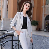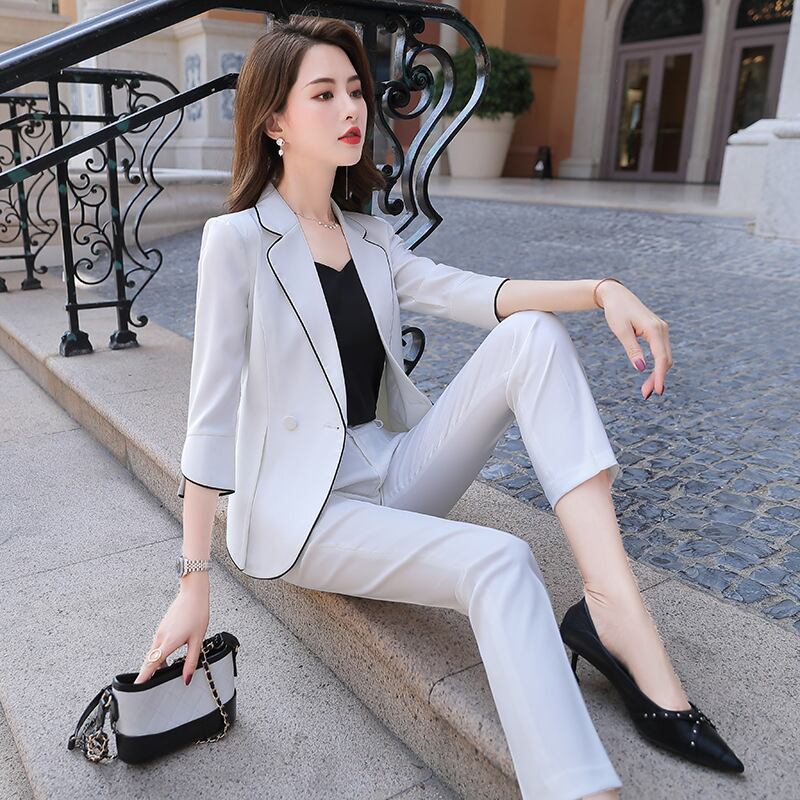 【新作】【送料無料】 ホワイトミッドスリーブプロスーツパンツスーツ女性2020夏新しいハイウエストホワイトカラービューティーサロンフロントデスクオーバーオール-アリババ ハイウェスト サマー 夏物 12b327419258383