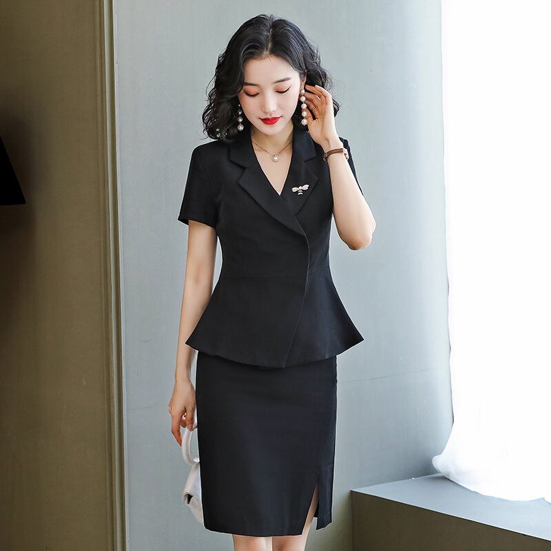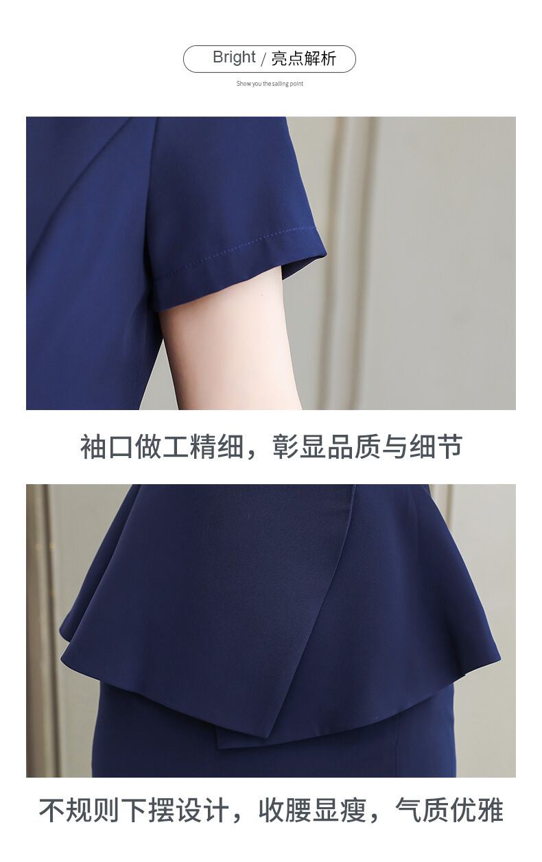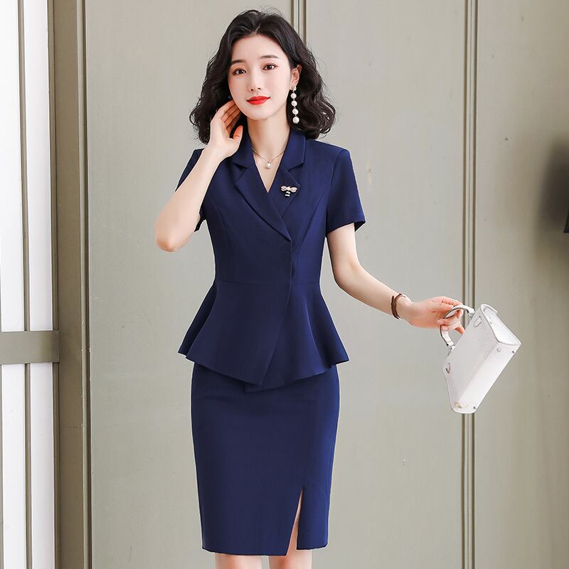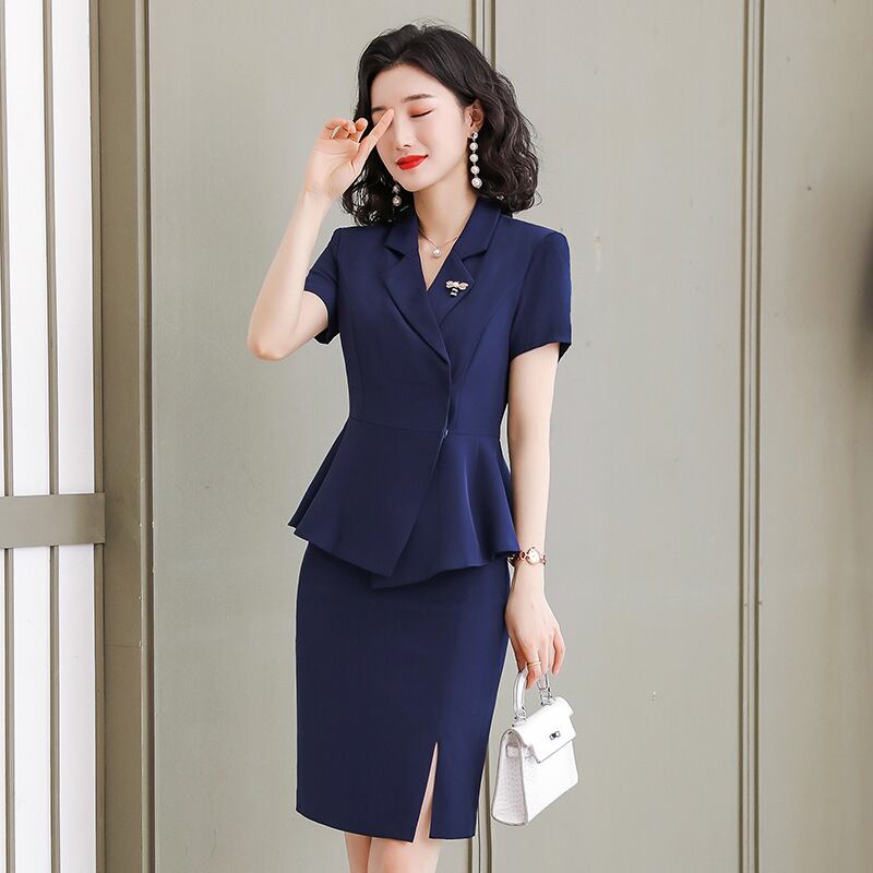 【新作】【送料無料】 2020ブルー半袖ツーピーススーツスカート女性ビジネス通勤プロホワイトカラー通勤インタビュー美容院オーバーオール-アリババ 12b328964287269