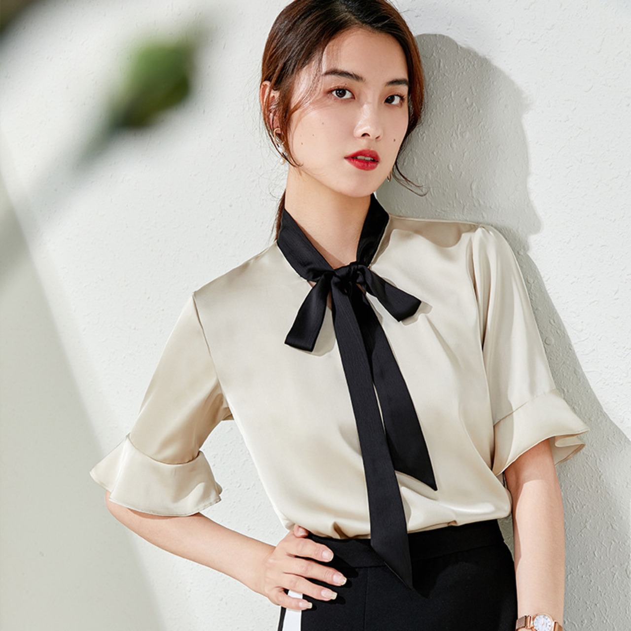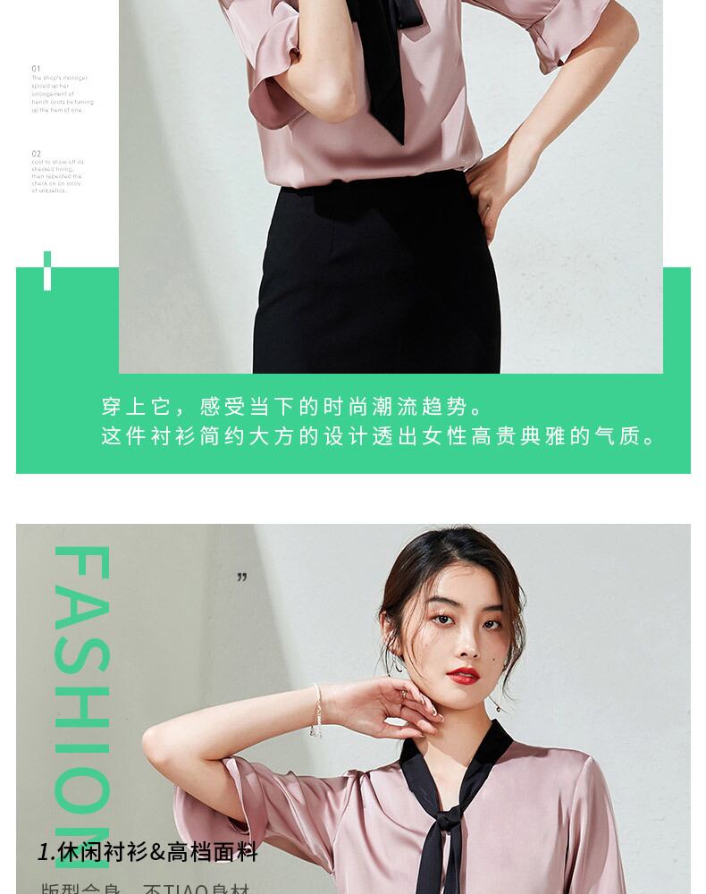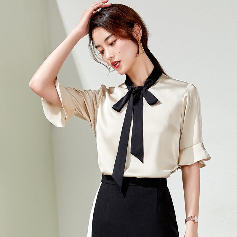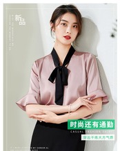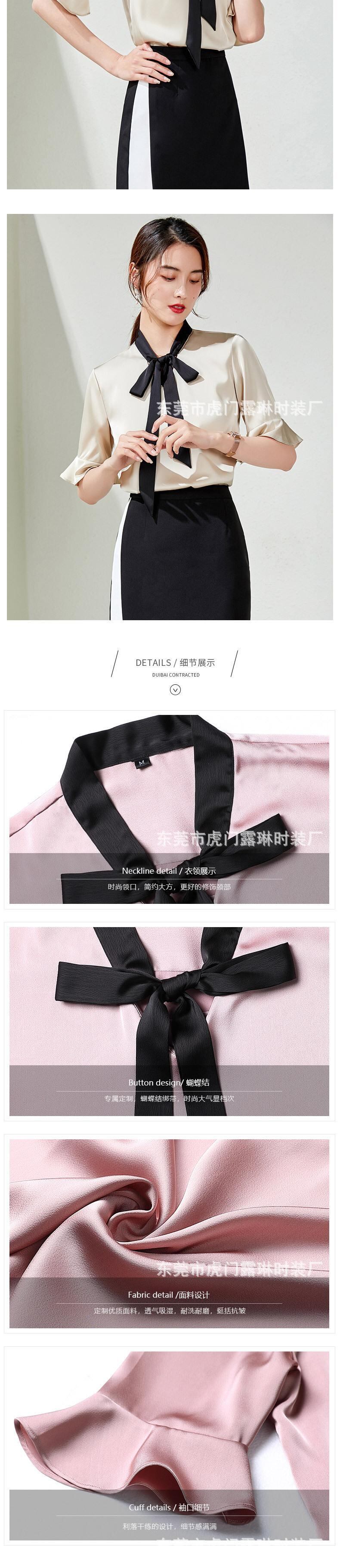 【新作】【送料無料】 ピンクのコントラストカラーのスタンドアップカラーのレースアップホーンミッドスリーブシャツ2020夏の新しい女性の通勤ハーフスリーブシャツ-アリババ サマー 夏物 12b390547473077
