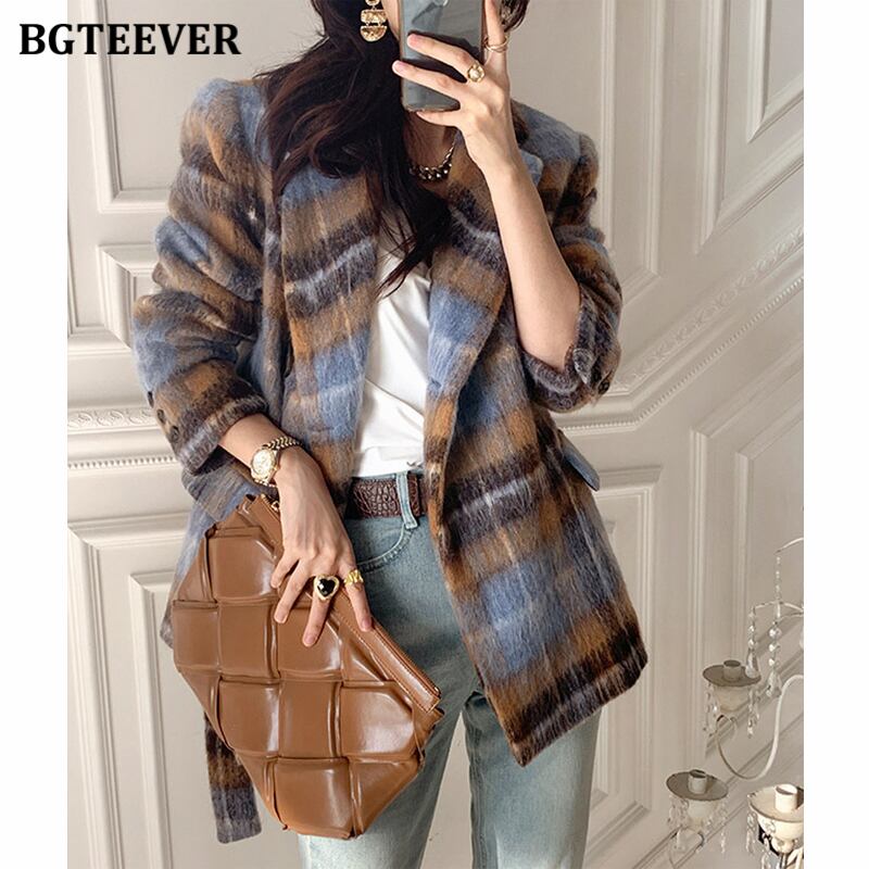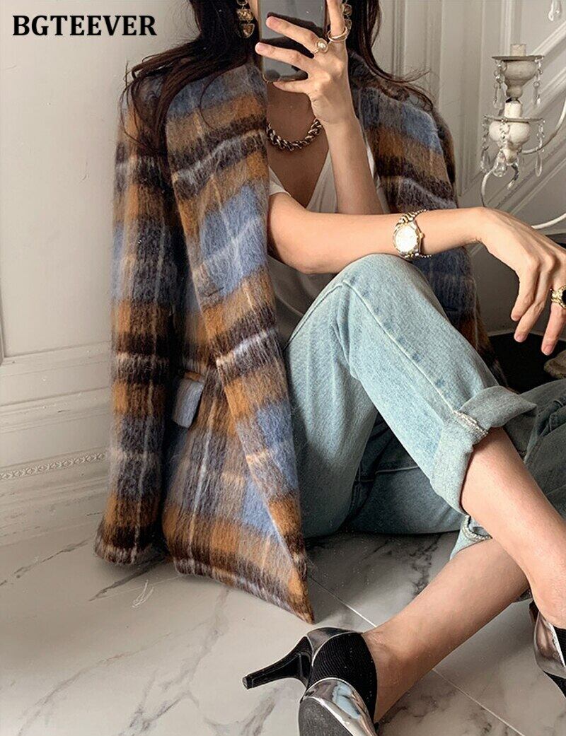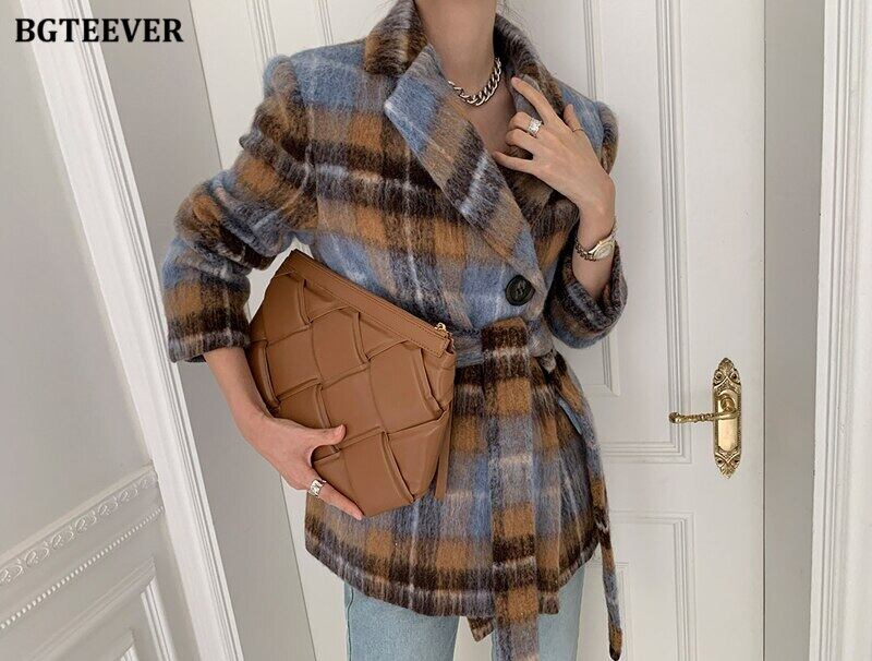 【新作】【送料無料】 春の暖かい厚い女性の格子縞のウールのジャケットヴィンテージノッチ付きカラールーズレースアップワンボタンブレンドコート スプリング 春物 ビンテージ 12b131130285297