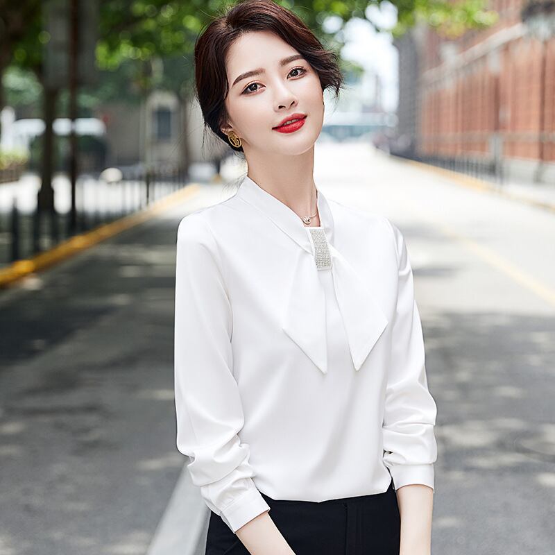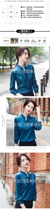 【新作】【送料無料】 ブルーサテンプルオーバー長袖シャツ2020秋と冬の新しい女性の通勤ビジネスウェアホワイトカラーデザインのブラウス-アリババ ロング オータム 秋物 ウィンター 冬物 12b379210444098