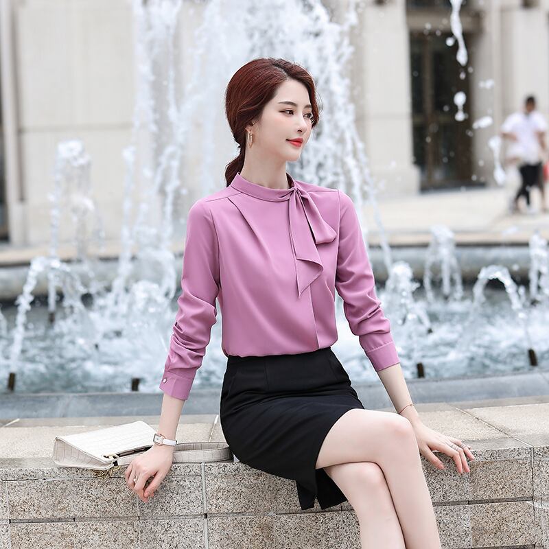 【新作】【送料無料】 コミューター長袖シフォンシャツパープルエレガント2020秋新しいプロホワイトカラールーズスリムプルオーバートップ-アリババ ロング オータム 秋物 12b395540700376