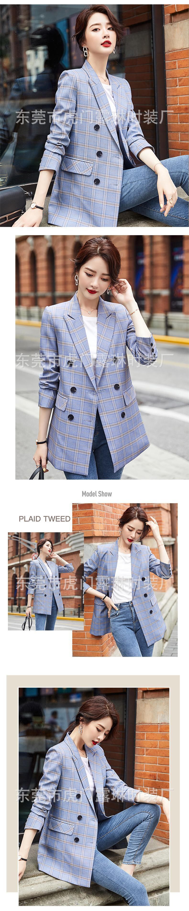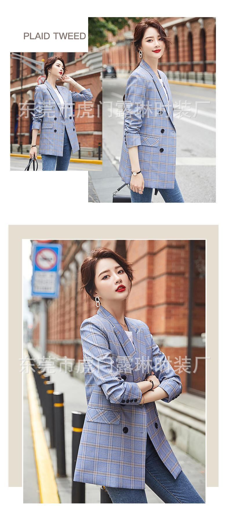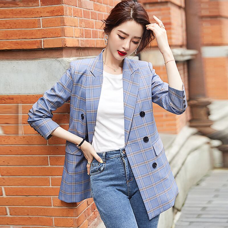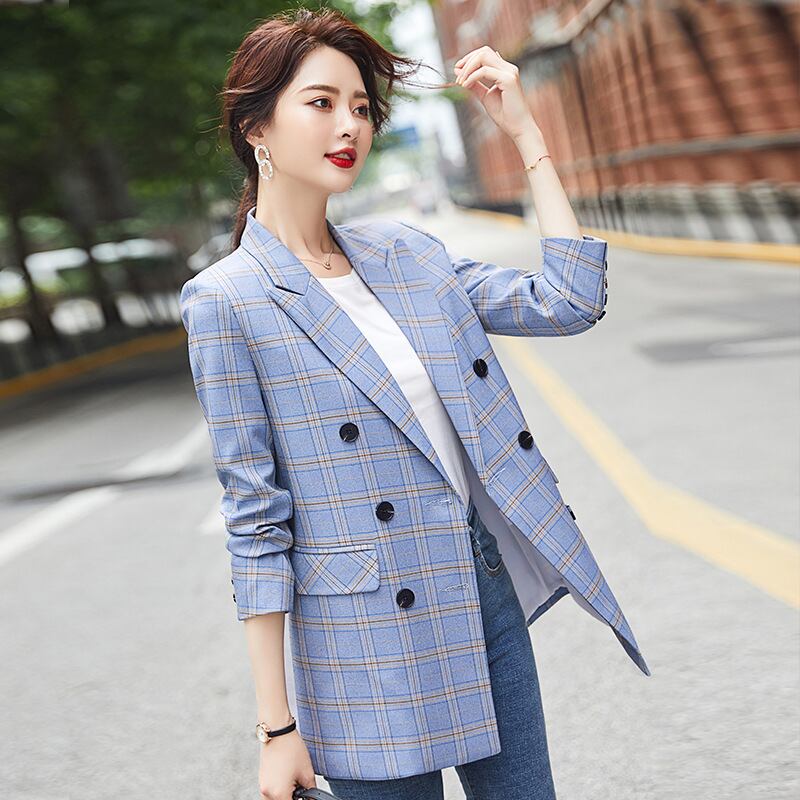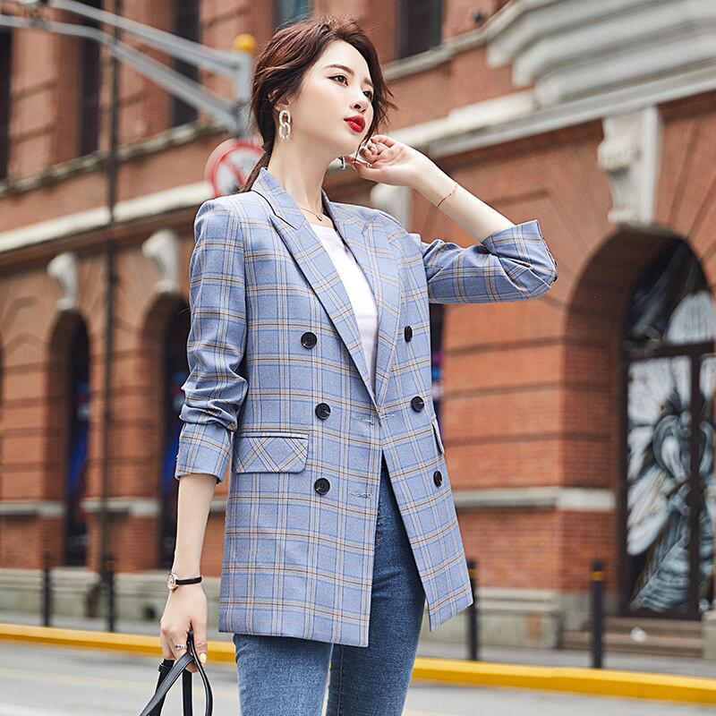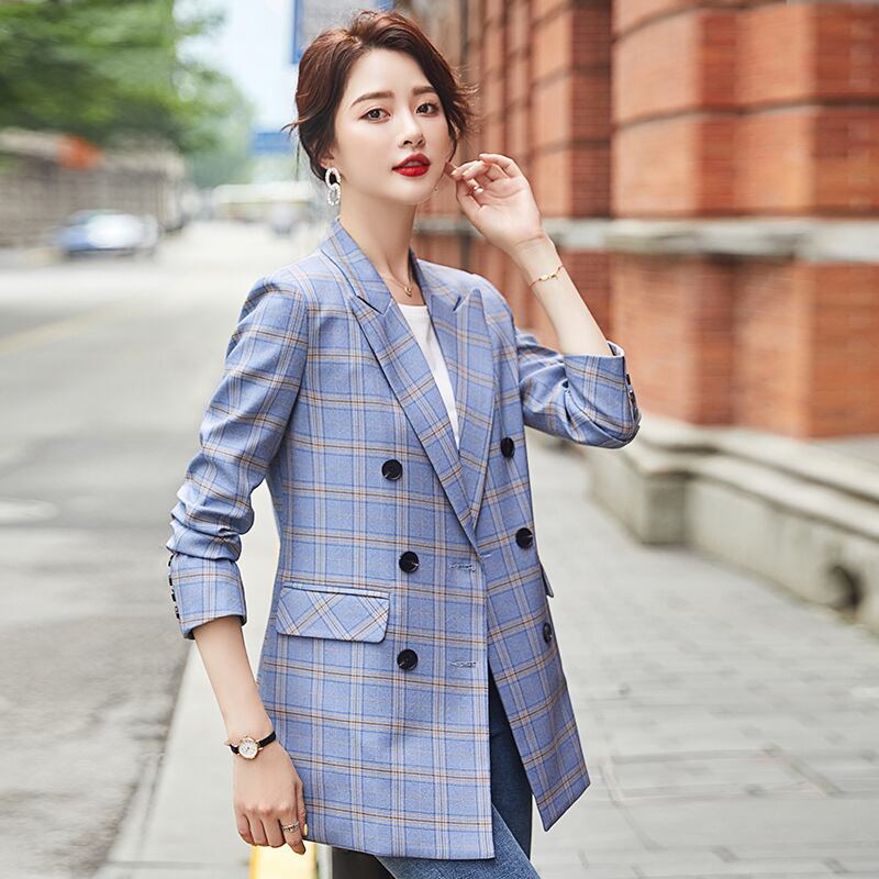 【新作】【送料無料】 ブルーチェック柄ジャケット2020秋冬新作レディースウエスタンスタイルルック薄手の気質ダブルブレストミドル丈スモールスーツ-アリババ オータム 秋物 ウィンター 冬物 12b344177254712