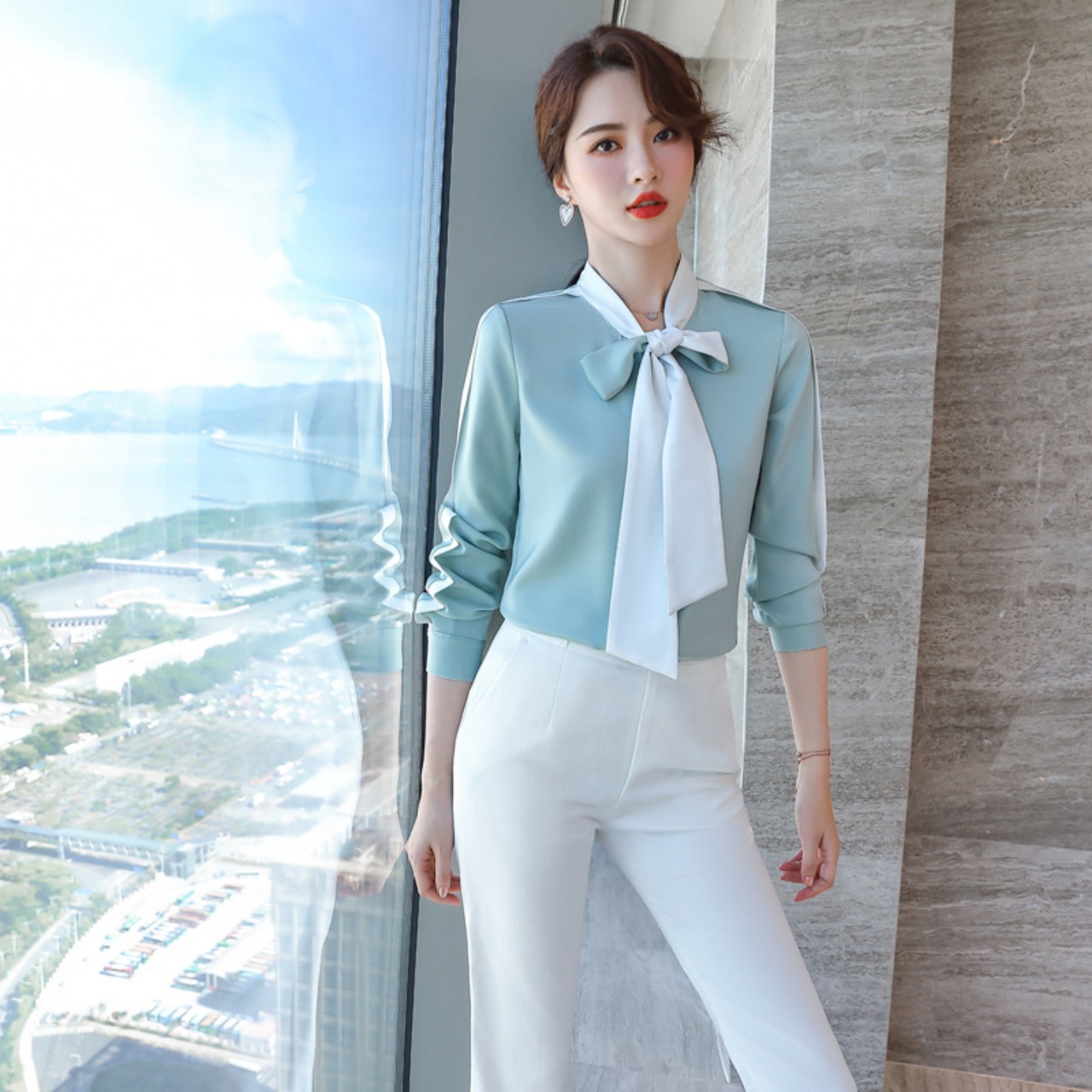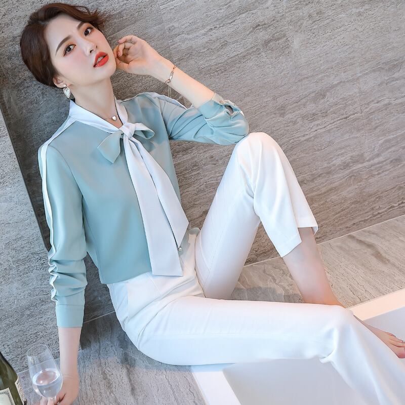 【新作】【送料無料】 センスコントラストカラースタンドアップカラーリボン気質ブルーシャツ2020秋冬新作レディースホワイトエレガントプロフェッショナルトップス-アリババ オータム 秋物 ウィンター 冬物 12b387502075132