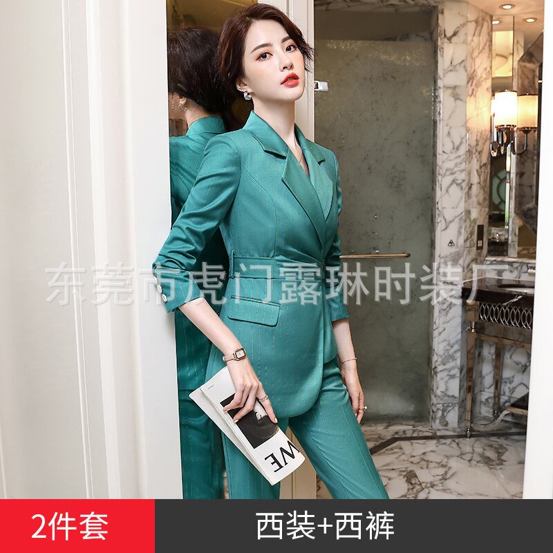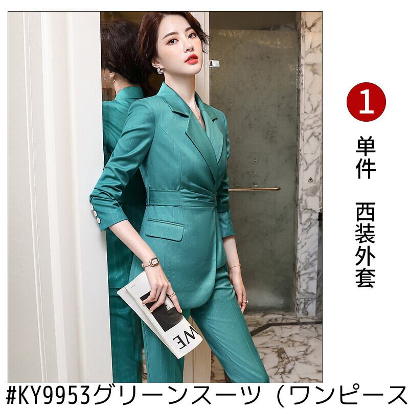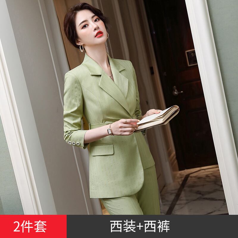 【新作】【送料無料】 緑の長袖ストライプハイウエスト調節可能なレースアップスーツ女性の2020年秋冬の新しいプロフェッショナルで有能なスーツ-アリババ ロング オータム 秋物 ウィンター 冬物 アジャスタブル グリーン 12b392937817888