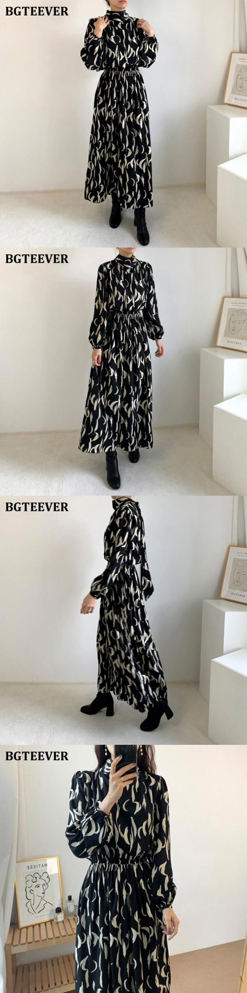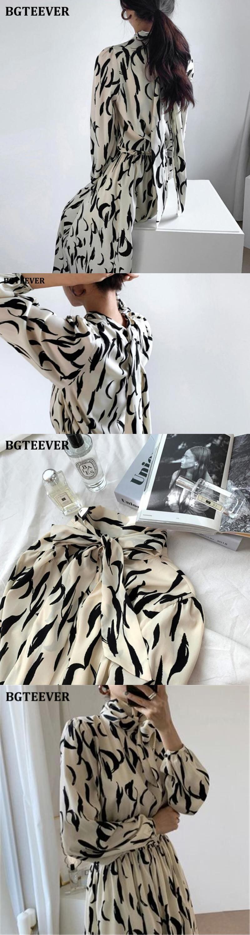 【新作】【送料無料】 BGTEEVERボウネックレースアップレディースプリントドレス長袖伸縮性ウエストAラインドレス2021Vestidos ロング リボン エラスティック 12b111582451145