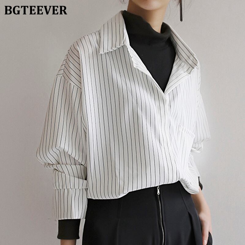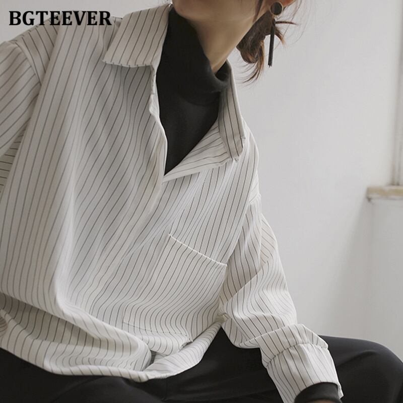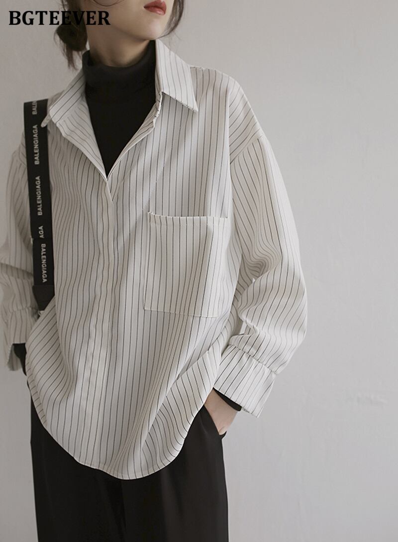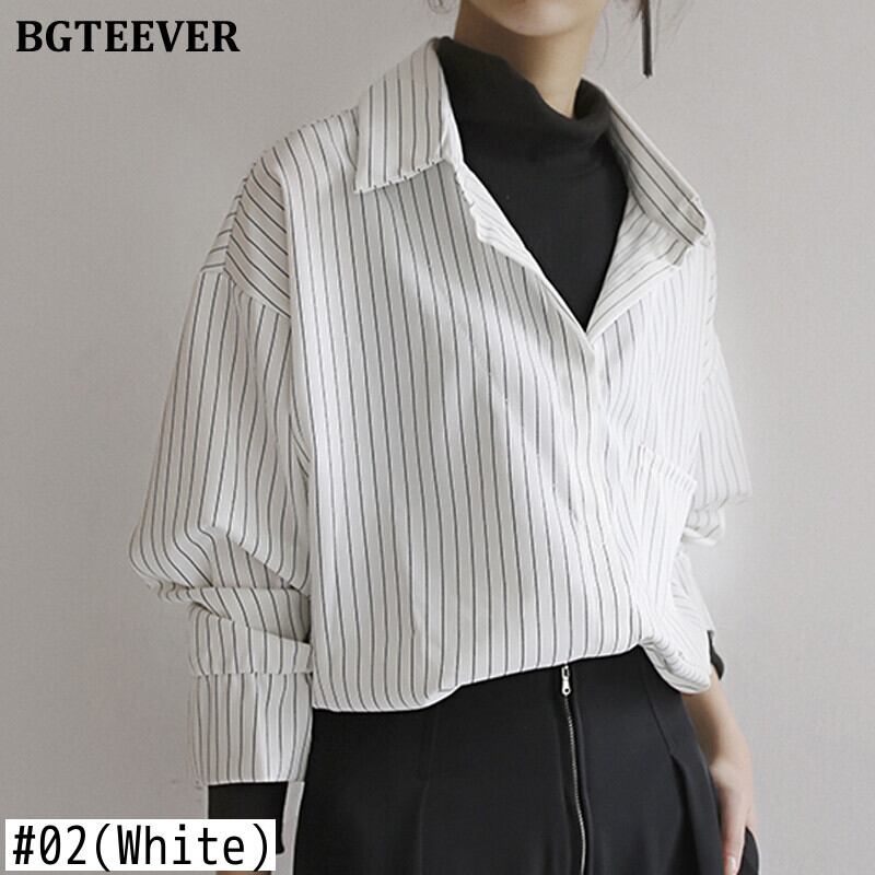 【新作】【送料無料】 BGTEEVERスタイリッシュなストライプの女性フェイク2ピースブラウストップスワンポケットヴィンテージシャツ2021春ラペル長袖 ロング スプリング 春物 ビンテージ 12b190789791279