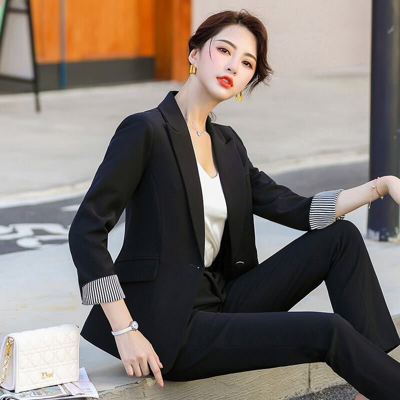 【新作】【送料無料】 黒の長袖カジュアルスーツスーツパンツレディース2021年秋冬新プロウェアツーピーススーツ年齢短縮 ロング ブラック オータム 秋物 ウィンター 冬物 12b398953303379
