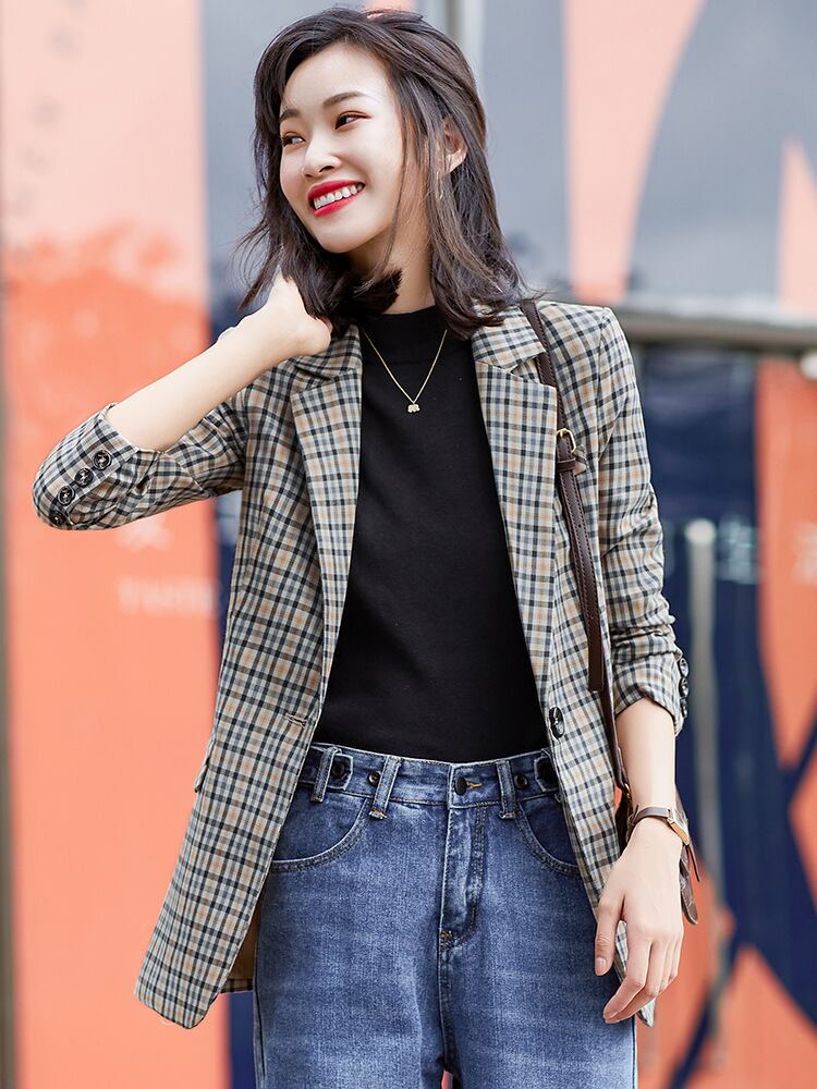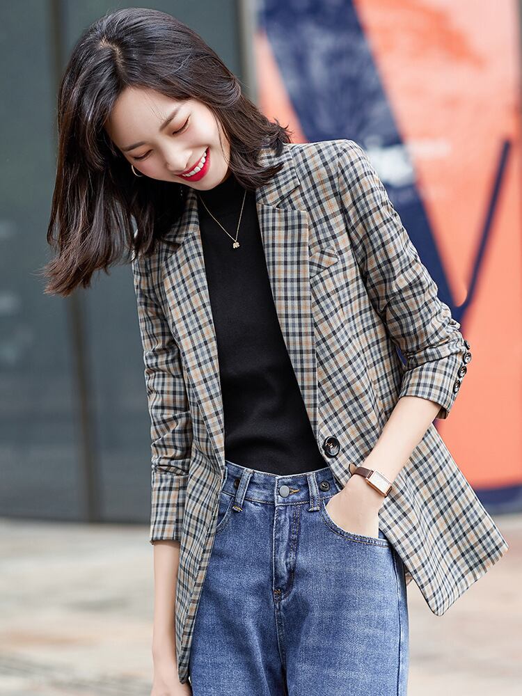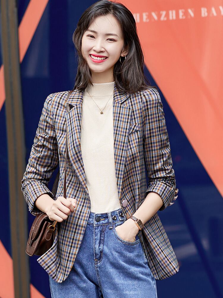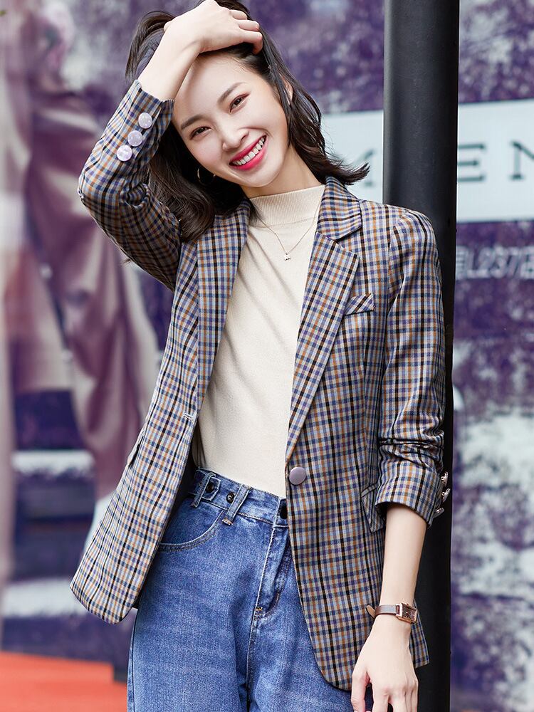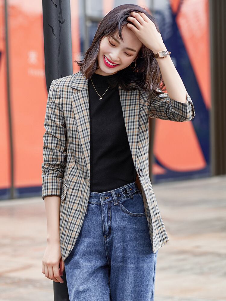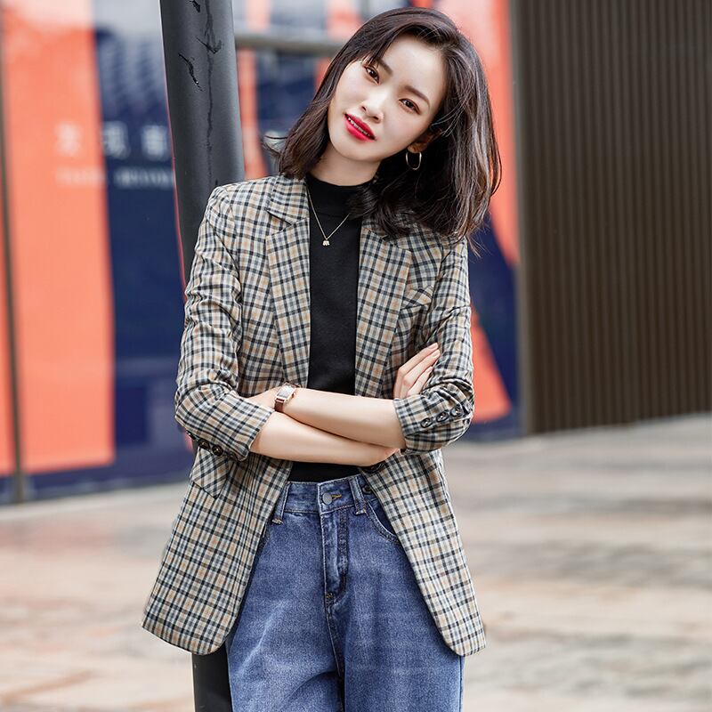 【新作】【送料無料】 チェック柄スモールスーツジャケット女性スタイルスモールアウターウェアスモールスーツジャケットファッションアウターウェアブラウンプロウェア-アリババ 12b361304459306