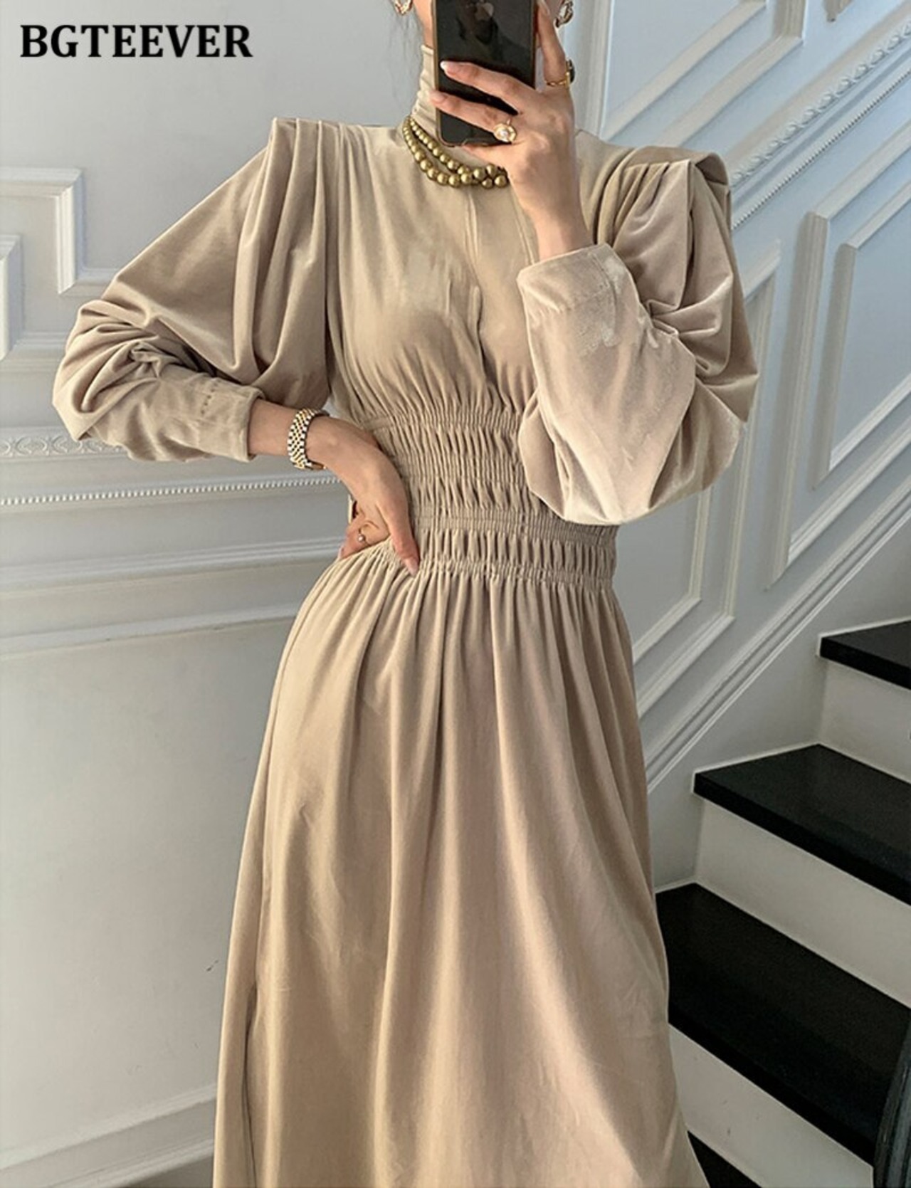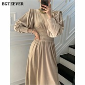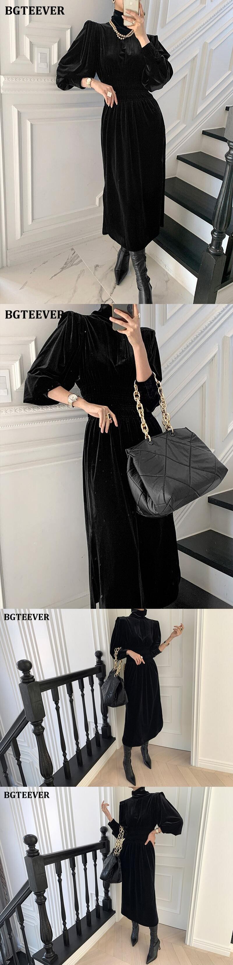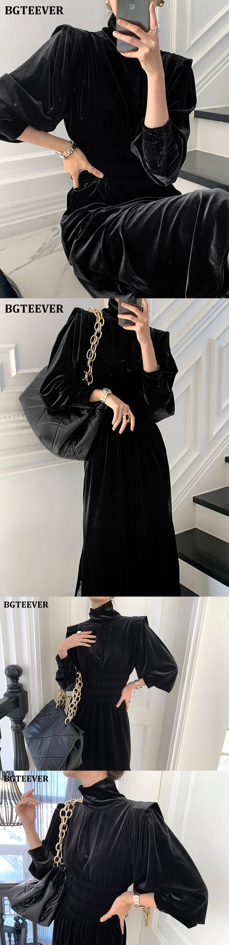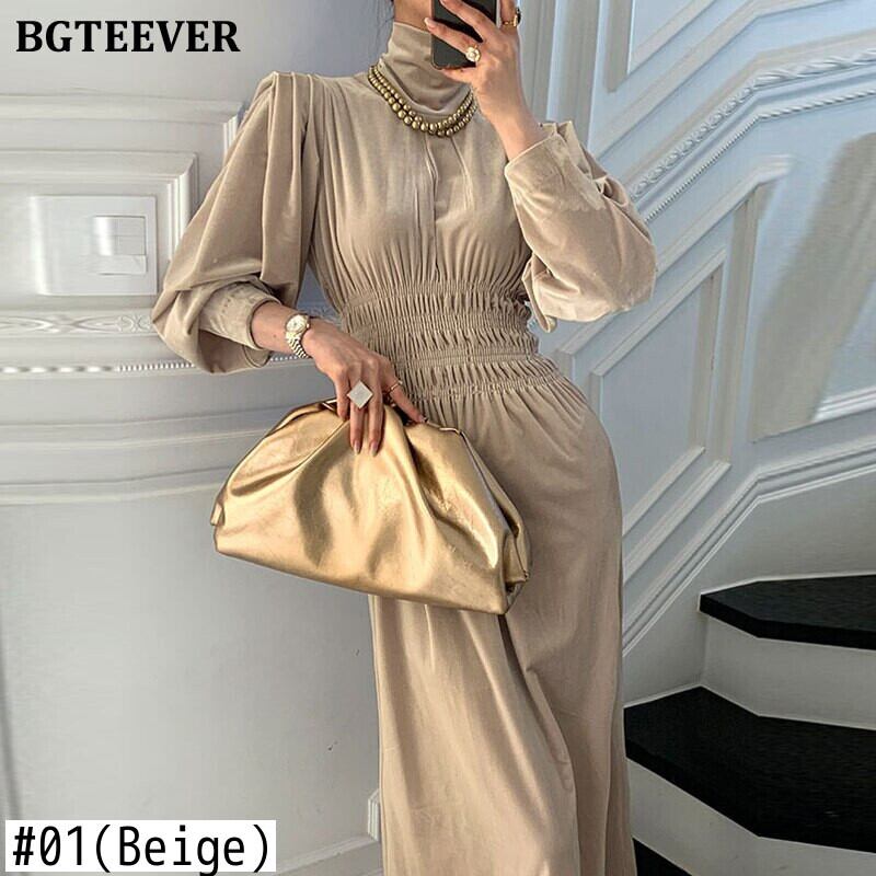 【新作】【送料無料】 BGTEEVER春の女性タートルネックベルベットドレスランタンスリーブ伸縮性ウエストミドル丈ドレスサイドスプリットVestidos エラスティック スプリング 春物 12b151987542810