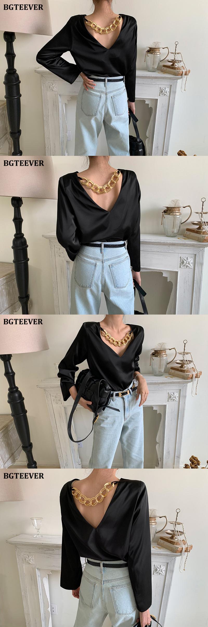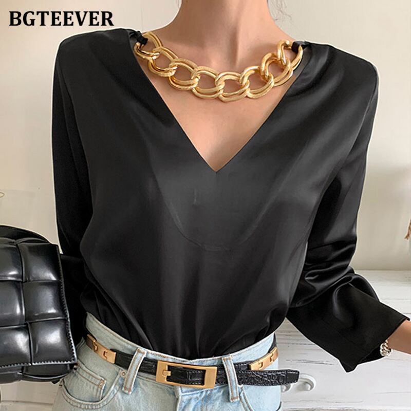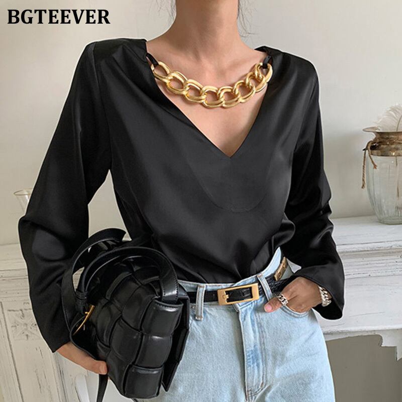 【新作】【送料無料】 BGTEEVERシックなVネックチェーンツーウェイシャツブラウス女性2021春フルスリーブルーズプルオーバートップス スプリング 春物 12b125410425366