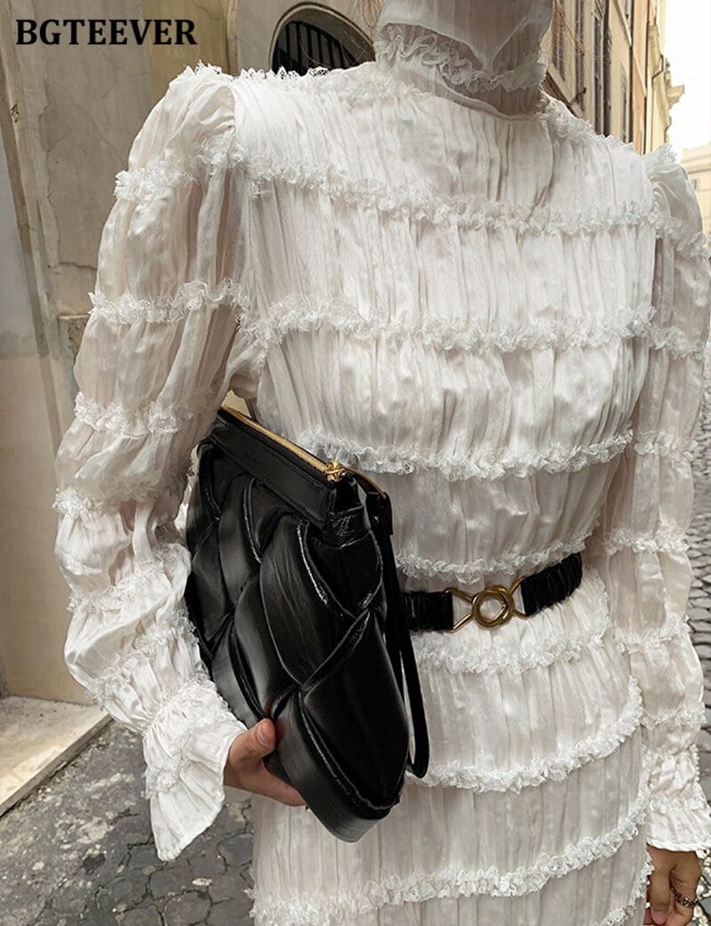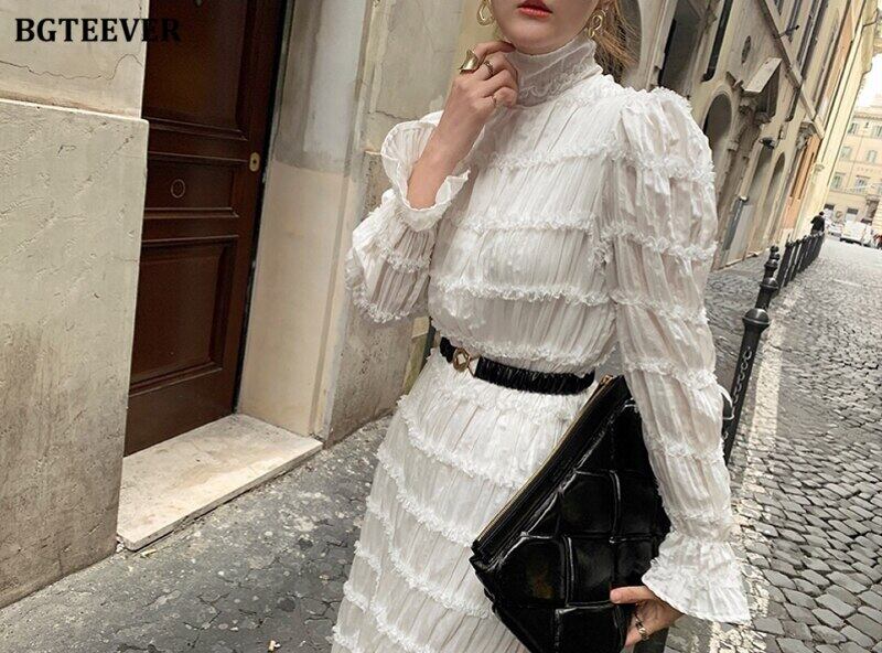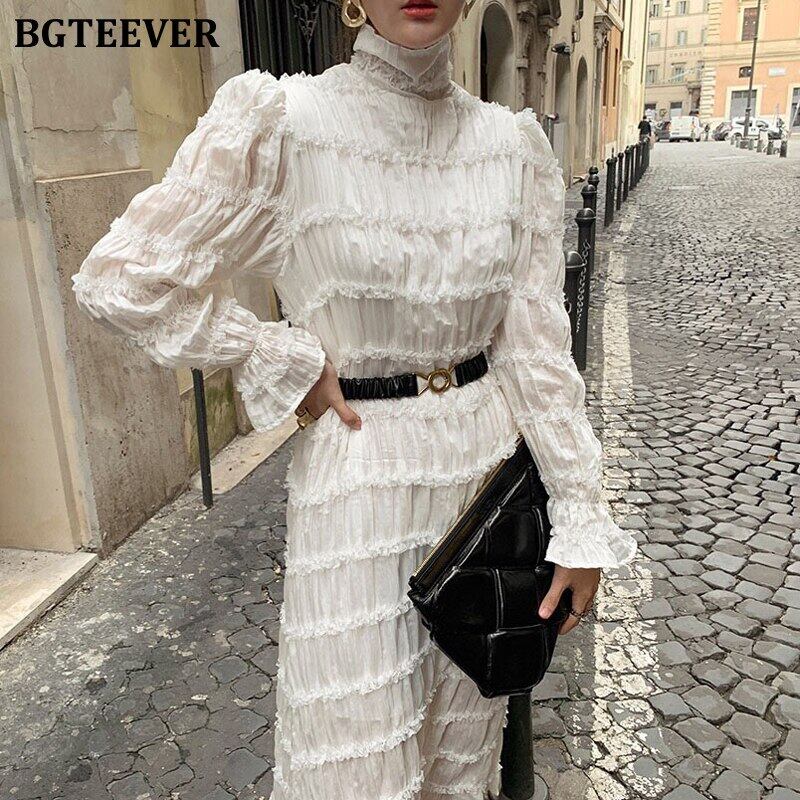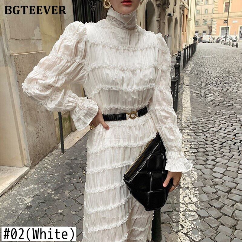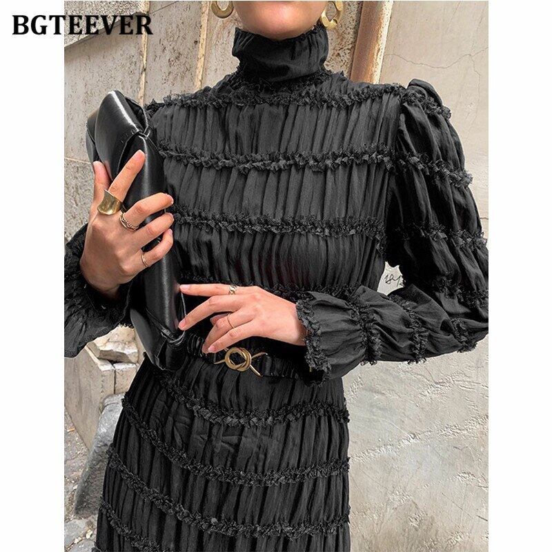 【新作】【送料無料】 BGTEEVERシックなタートルネックの女性のレースのドレス長袖スリムウエストベルト付きミディドレス2021春の固体Vestidos ロング スプリング 春物 ハーネス ソリッドカラー 12b157942767396