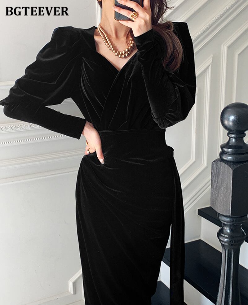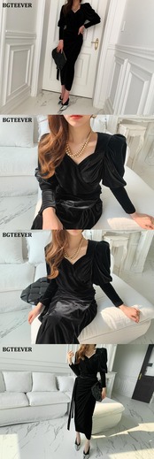 【新作】【送料無料】 BGTEEVERシックなスクエアカラーベルベットドレス2021春スリムウエストボディコンVestidosヴィンテージ女性長袖ミディドレス ロング スプリング 春物 スクウェア ビンテージ 12b143581917379