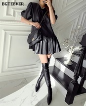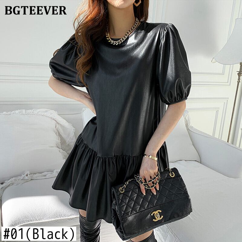 【新作】【送料無料】 BGTEEVERパフスリーブレディースPUレザーソリッドドレスヴィンテージOネックルーズフェイクレザープリーツミニ ファー ソリッドカラー ビンテージ 12b179429943455
